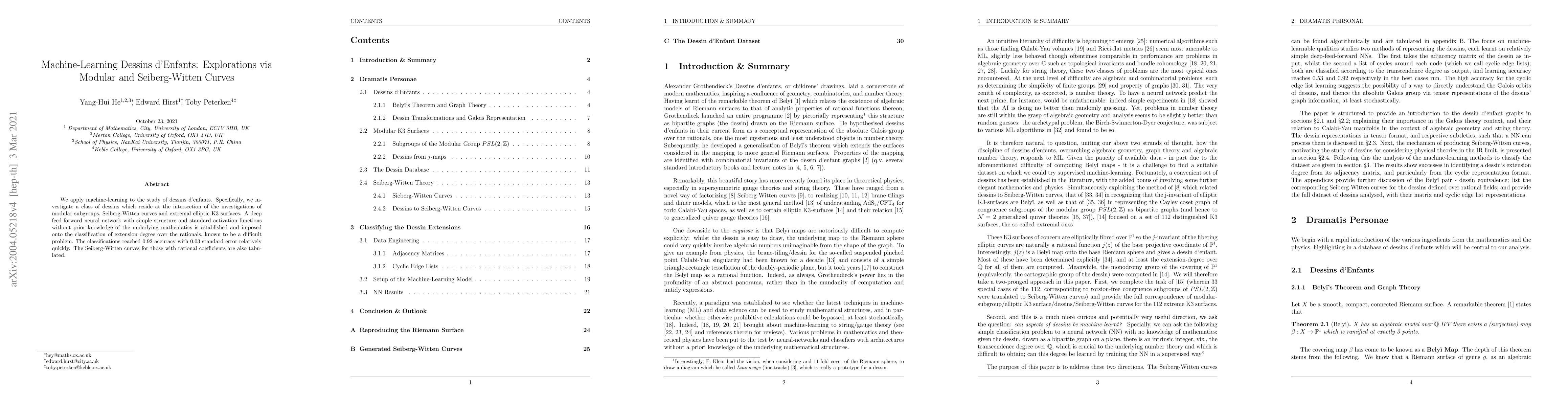 This paper applies machine learning to classify dessins d'enfants, intersecting modular subgroups, Seiberg-Witten curves, and elliptic K3 surfaces. A simple neural network achieved 0.92 accuracy in classifying extension degrees over rationals, a traditionally challenging problem.