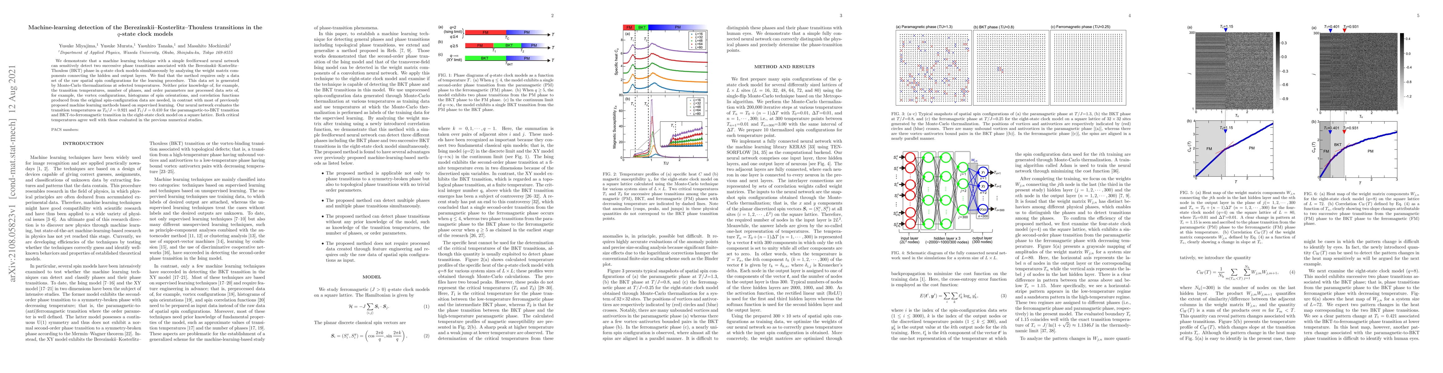 We demonstrate that a machine learning technique with a simple feedforward neural network can sensitively detect two successive phase transitions associated with the Berezinskii-Kosterlitz-Thouless (BKT) phase in q-state clock models simultaneously by analyzing the weight matrix components connecting the hidden and output layers. We find that the method requires only a data set of the raw spatial spin configurations for the learning procedure. This data set is generated by Monte-Carlo thermalizations at selected temperatures. Neither prior knowledge of, for example, the transition temperatures, number of phases, and order parameters nor processed data sets of, for example, the vortex configurations, histograms of spin orientations, and correlation functions produced from the original spin-configuration data are needed, in contrast with most of previously proposed machine learning methods based on supervised learning. Our neural network evaluates the transition temperatures as T_2/J=0.921 and T_1/J=0.410 for the paramagnetic-to-BKT transition and BKT-to-ferromagnetic transition in the eight-state clock model on a square lattice. Both critical temperatures agree well with those evaluated in the previous numerical studies.