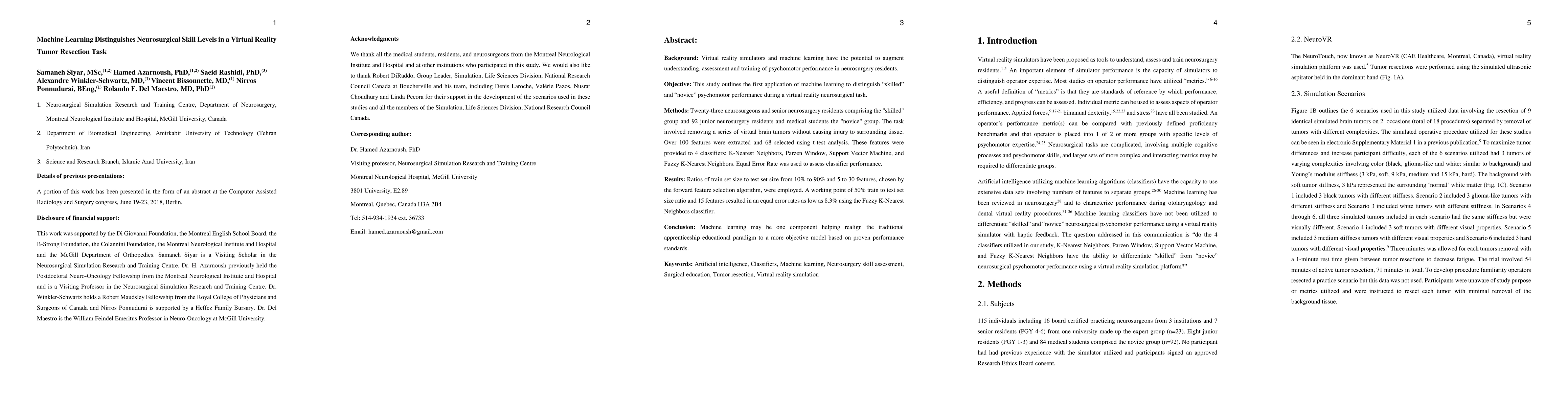 Background: Virtual reality simulators and machine learning have the potential to augment understanding, assessment and training of psychomotor performance in neurosurgery residents. Objective: This study outlines the first application of machine learning to distinguish "skilled" and "novice" psychomotor performance during a virtual reality neurosurgical task. Methods: Twenty-three neurosurgeons and senior neurosurgery residents comprising the "skilled" group and 92 junior neurosurgery residents and medical students the "novice" group. The task involved removing a series of virtual brain tumors without causing injury to surrounding tissue. Over 100 features were extracted and 68 selected using t-test analysis. These features were provided to 4 classifiers: K-Nearest Neighbors, Parzen Window, Support Vector Machine, and Fuzzy K-Nearest Neighbors. Equal Error Rate was used to assess classifier performance. Results: Ratios of train set size to test set size from 10% to 90% and 5 to 30 features, chosen by the forward feature selection algorithm, were employed. A working point of 50% train to test set size ratio and 15 features resulted in an equal error rates as low as 8.3% using the Fuzzy K-Nearest Neighbors classifier. Conclusion: Machine learning may be one component helping realign the traditional apprenticeship educational paradigm to a more objective model based on proven performance standards. Keywords: Artificial intelligence, Classifiers, Machine learning, Neurosurgery skill assessment, Surgical education, Tumor resection, Virtual reality simulation