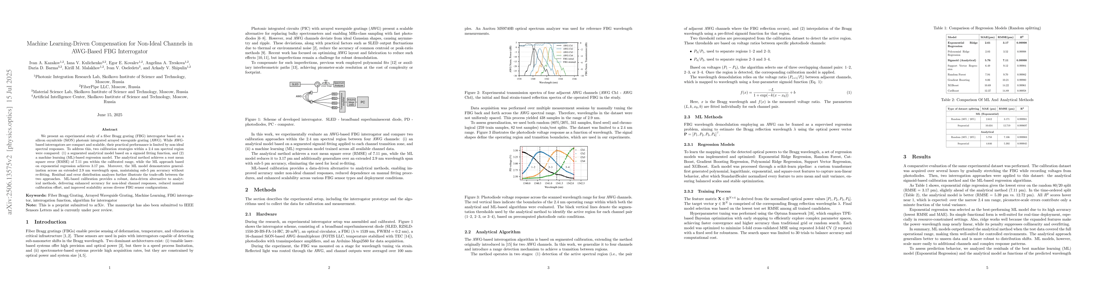 We present an experimental study of a fiber Bragg grating (FBG) interrogator based on a silicon oxynitride (SiON) photonic integrated arrayed waveguide grating (AWG). While AWG-based interrogators are compact and scalable, their practical performance is limited by non-ideal spectral responses. To address this, two calibration strategies within a 2.4 nm spectral region were compared: (1) a segmented analytical model based on a sigmoid fitting function, and (2) a machine learning (ML)-based regression model. The analytical method achieves a root mean square error (RMSE) of 7.11 pm within the calibrated range, while the ML approach based on exponential regression achieves 3.17 pm. Moreover, the ML model demonstrates generalization across an extended 2.9 nm wavelength span, maintaining sub-5 pm accuracy without re-fitting. Residual and error distribution analyses further illustrate the trade-offs between the two approaches. ML-based calibration provides a robust, data-driven alternative to analytical methods, delivering enhanced accuracy for non-ideal channel responses, reduced manual calibration effort, and improved scalability across diverse FBG sensor configurations.