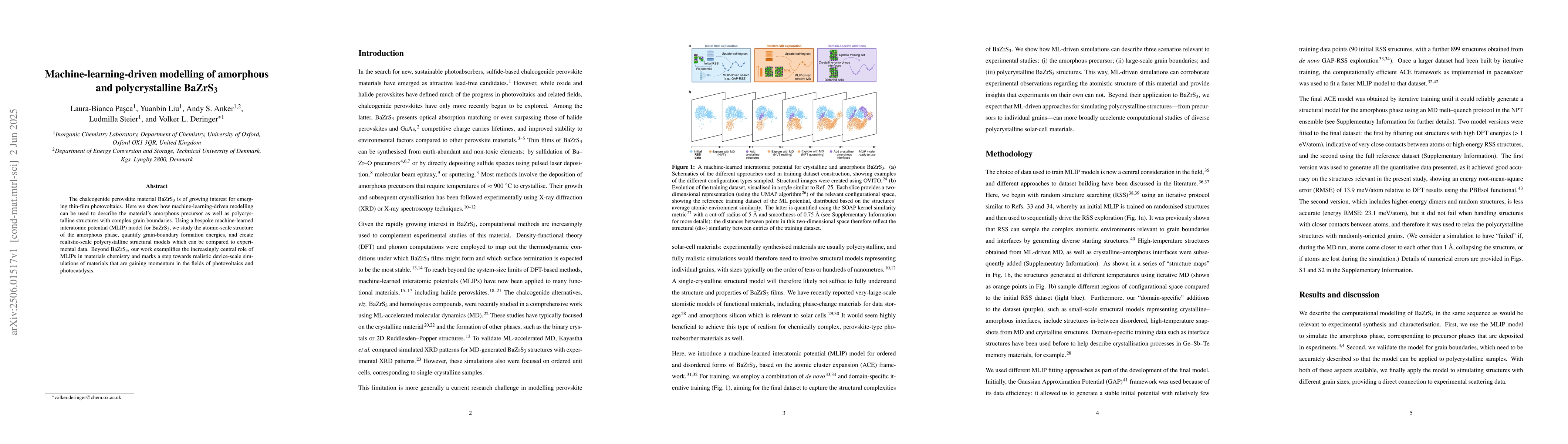 The research employs a bespoke machine-learned interatomic potential (MLIP) model for BaZrS3 to study its amorphous phase, quantify grain-boundary formation energies, and generate realistic polycrystalline structural models.