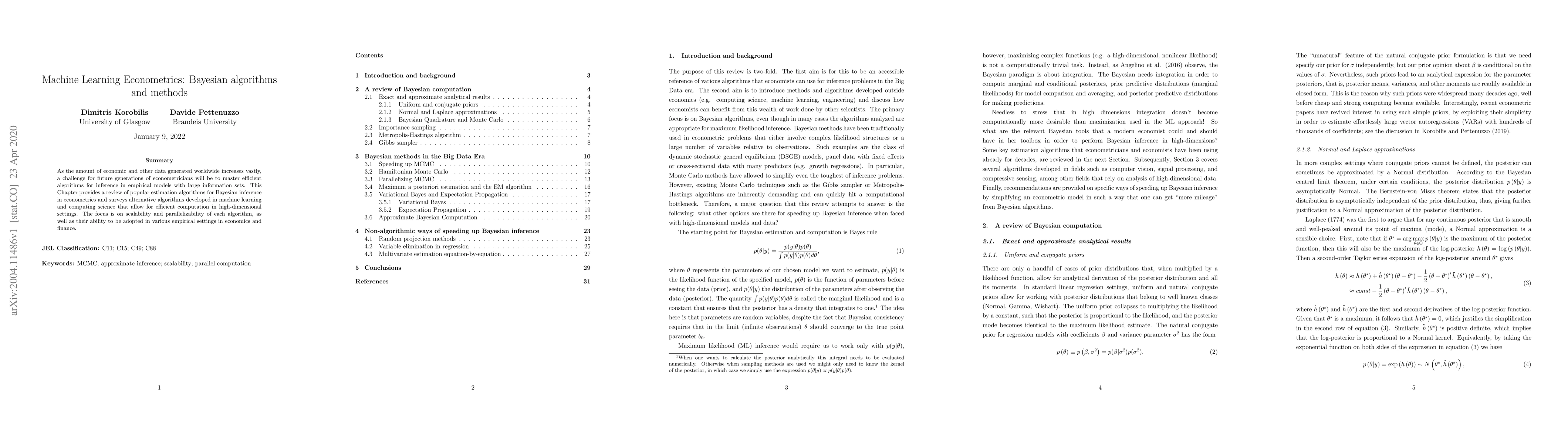 This chapter reviews Bayesian algorithms for efficient inference in large economic data sets, focusing on scalability and parallelizability. It explores alternative machine learning methods for high-dimensional settings to address the growing challenge of analyzing vast amounts of data.