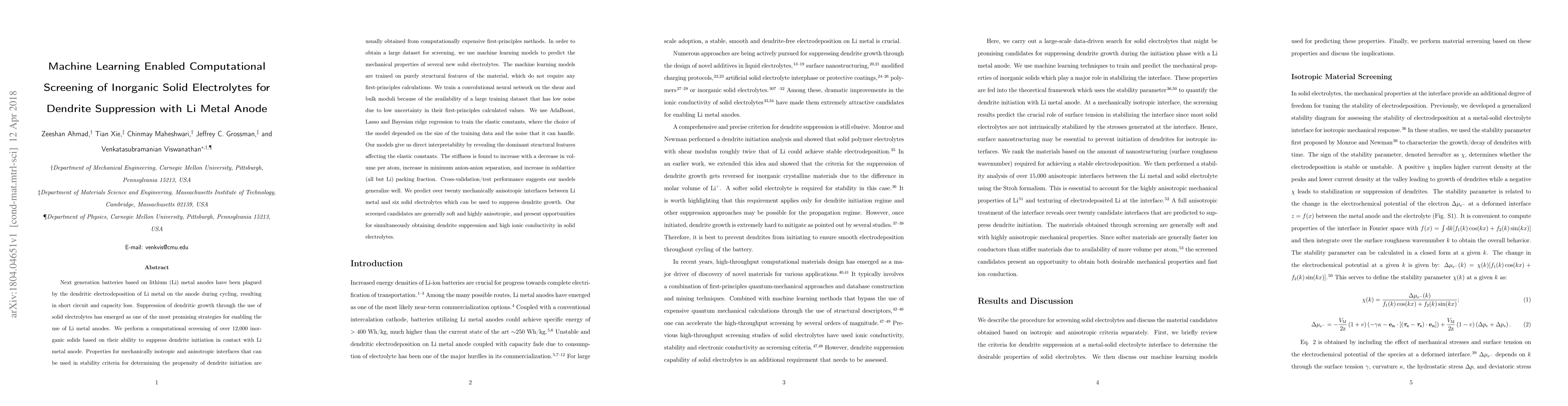 This research uses machine learning to computationally screen over 12,000 inorganic solid electrolytes for suppressing lithium dendrite growth in Li metal batteries. Models like convolutional neural networks and ensemble methods predict mechanical properties to identify materials that can stabilize the Li metal anode. The findings suggest soft, anisotropic electrolytes are promising candidates for dendrite suppression and high ionic conductivity.