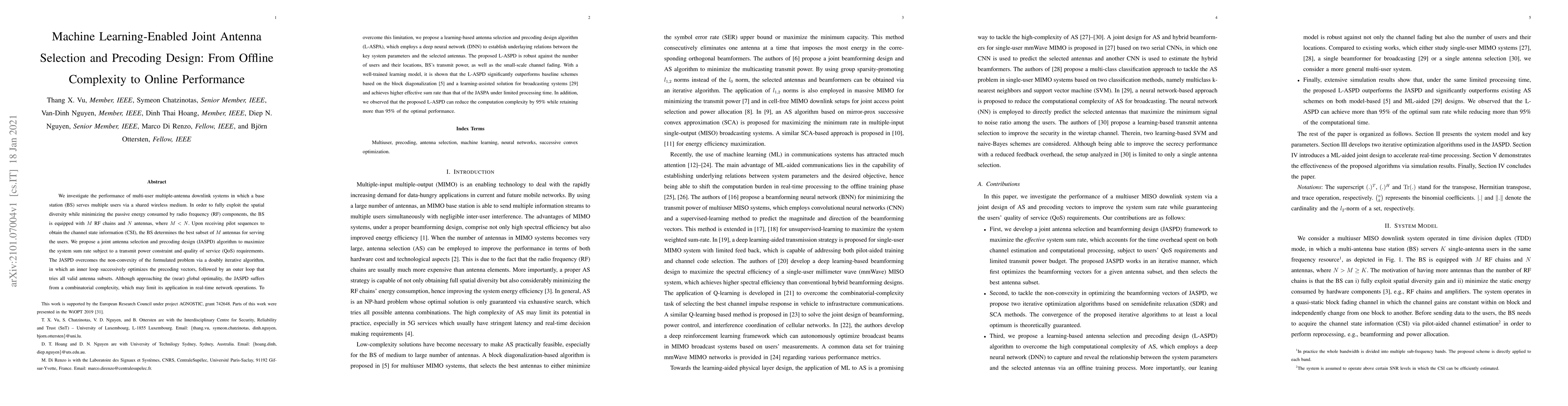 This paper proposes a machine learning-enabled joint antenna selection and precoding design algorithm (L-ASPA) to optimize multi-user downlink systems. The L-ASPA uses a DNN to reduce computational complexity by 95% while maintaining over 95% of the optimal performance of a more complex algorithm.