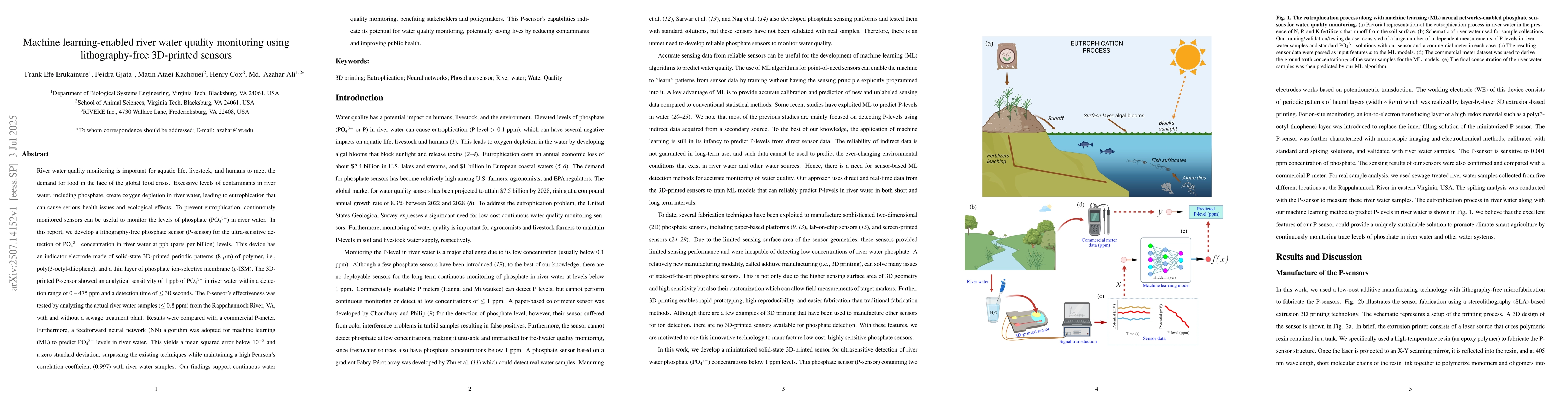 River water quality monitoring is important for aquatic life, livestock, and humans because clean water is critical to meeting food demand during the global food crisis. Excessive contaminants, including phosphate, deplete dissolved oxygen and trigger eutrophication, leading to serious health and ecological problems. Continuous sensors that track phosphate levels can therefore help prevent eutrophication. In this work we present a lithography-free phosphate sensor (P-sensor) that detects phosphate in river water at parts-per-billion levels. The device uses a solid-state indicator electrode formed by 3D-printed periodic polymer patterns (8 um feature size) coated with a thin phosphate ion-selective membrane. The P-sensor detects as little as 1 ppb phosphate across 0 - 475 ppm with a response time under 30 seconds. We validated the sensor on Rappahannock River water, Virginia (less than 0.8 ppm phosphate) at sites upstream and downstream of a sewage treatment plant and benchmarked the results against a commercial phosphate meter. A feed-forward neural network was trained to predict phosphate levels, achieving a mean-squared error below 1e-3, zero standard deviation, and a Pearson correlation coefficient of 0.997 for river samples. These results demonstrate a practical tool for continuous water-quality monitoring that can inform stakeholders and policymakers and ultimately improve public health.