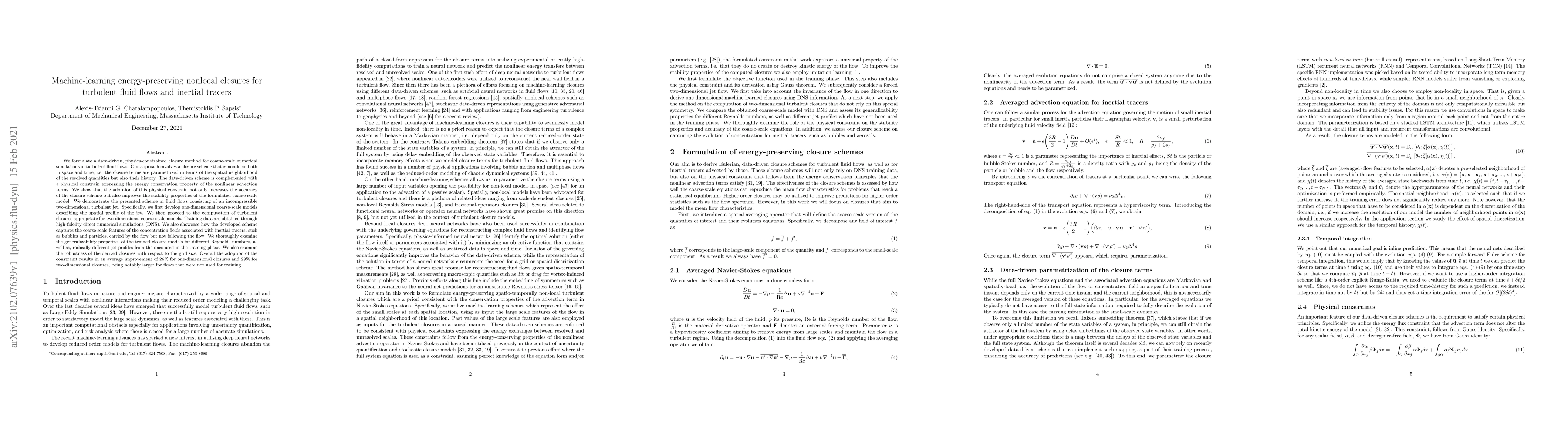 This paper proposes a data-driven, physics-constrained nonlocal closure method for simulating turbulent fluid flows and inertial tracers. The method enhances accuracy and stability through energy conservation, demonstrating significant improvements in coarse-scale models for both one-dimensional and two-dimensional turbulent jets.
