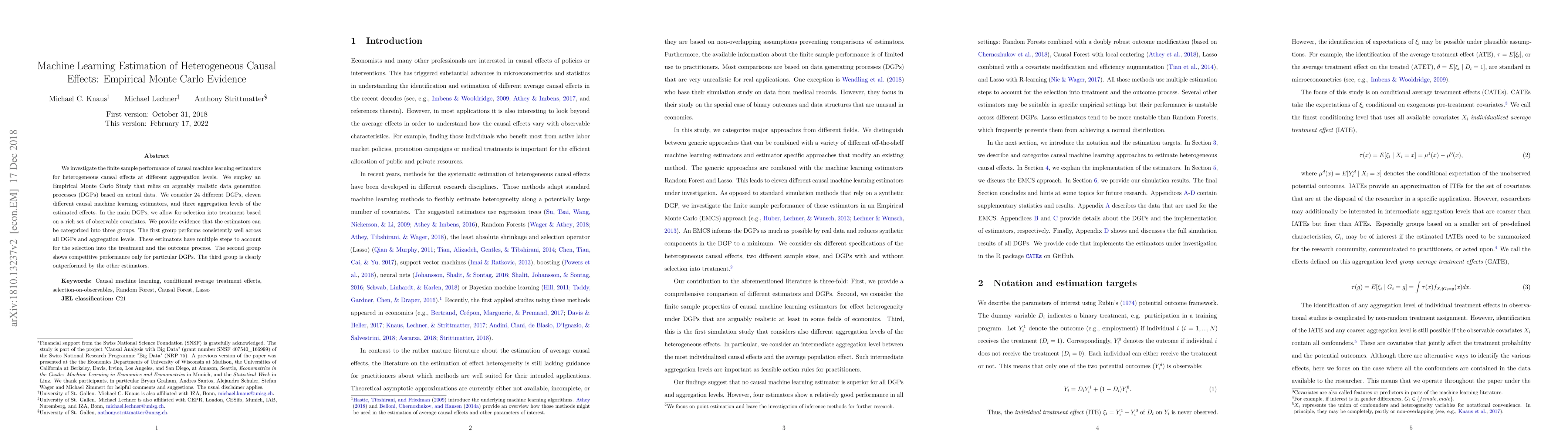 This paper evaluates the performance of causal machine learning estimators for heterogeneous causal effects through an Empirical Monte Carlo Study, revealing three distinct groups of estimators based on their consistency across various realistic data generation processes and aggregation levels. The best-performing estimators effectively account for selection into treatment.