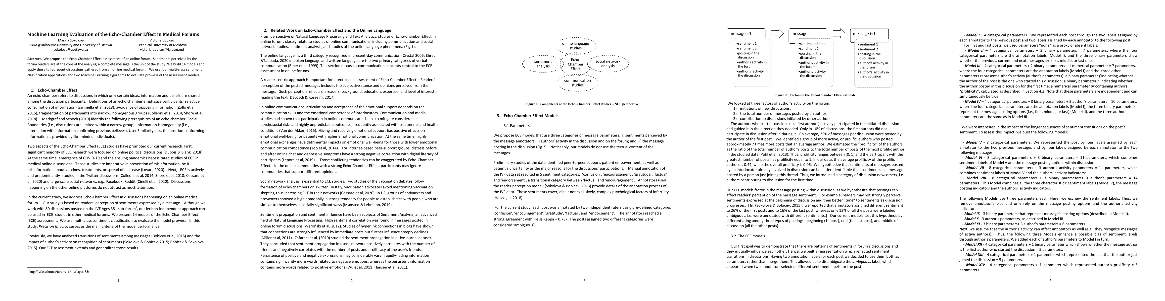 This research evaluates the Echo-Chamber Effect in an online medical forum by analyzing sentiments expressed in complete messages. It builds 14 models using four multi-class sentiment classifiers and two Machine Learning algorithms to assess the forum's discussion dynamics.