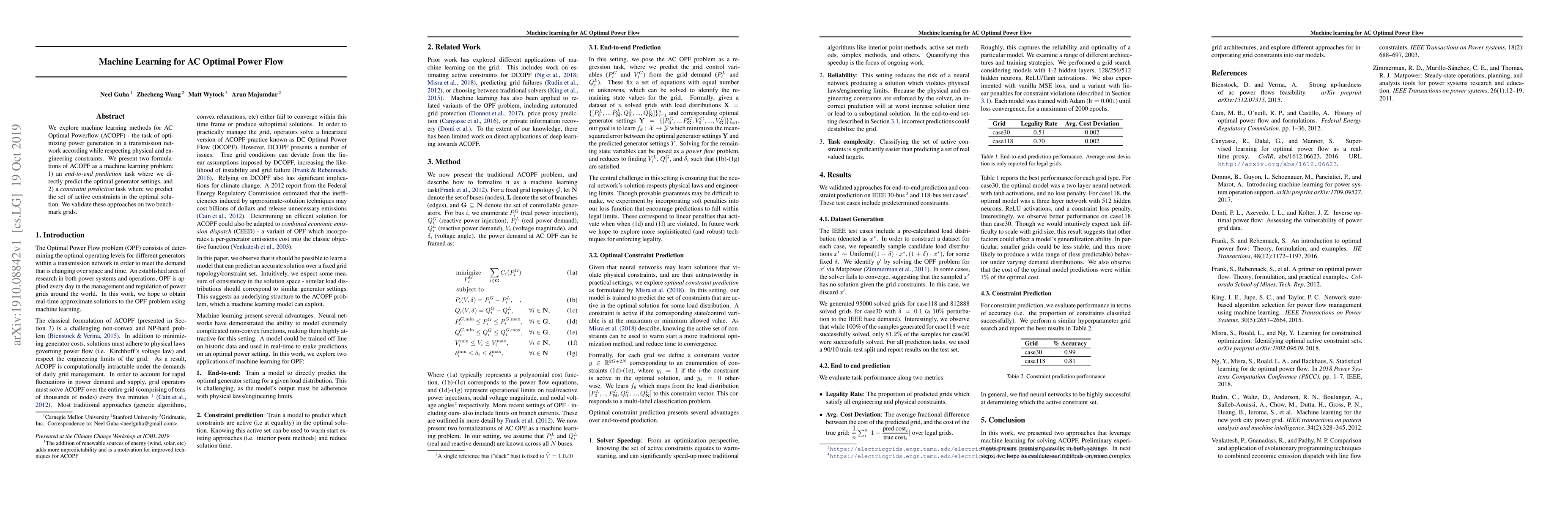 We explore machine learning methods for AC Optimal Powerflow (ACOPF) - the task of optimizing power generation in a transmission network according while respecting physical and engineering constraints. We present two formulations of ACOPF as a machine learning problem: 1) an end-to-end prediction task where we directly predict the optimal generator settings, and 2) a constraint prediction task where we predict the set of active constraints in the optimal solution. We validate these approaches on two benchmark grids.