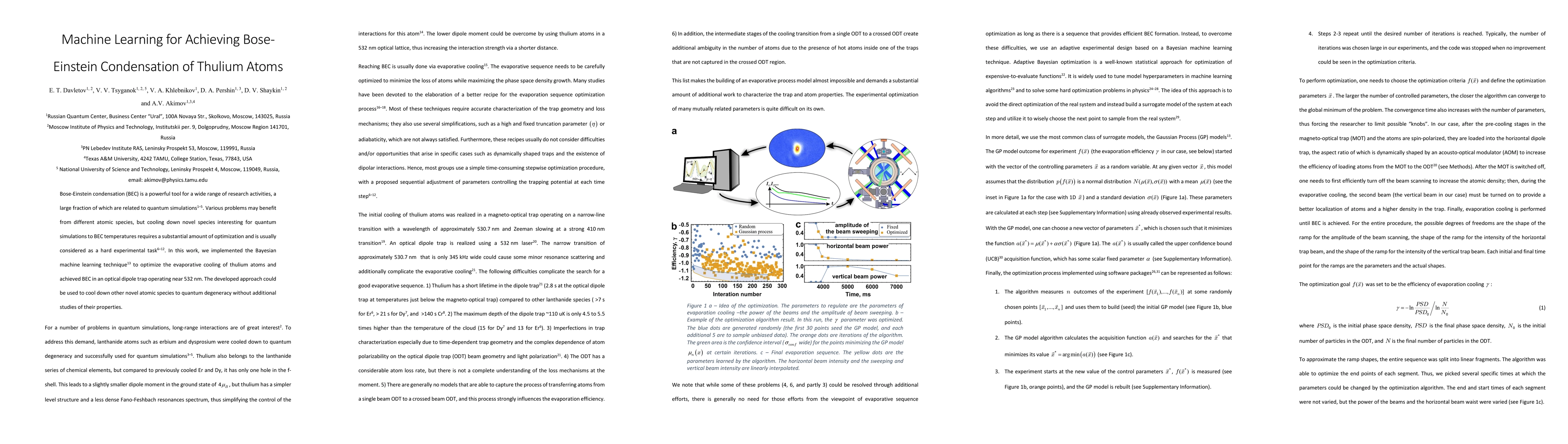 This paper utilizes Bayesian machine learning to optimize the evaporative cooling process for thulium atoms, successfully achieving Bose-Einstein condensation in an optical dipole trap. The developed method can potentially be applied to cool other novel atomic species for quantum simulations.