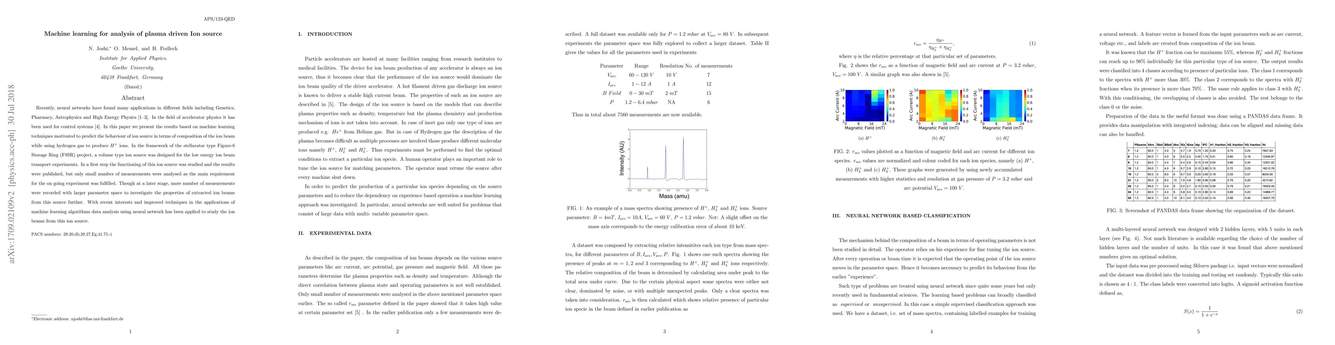 Recently, neural networks have found many applications in different fields including Genetics, Pharmacy, Astrophysics and High Energy Physics [1-3]. In the field of accelerator physics it has been used for control systems [4]. In this paper we present the results based on machine learning techniques motivated to predict the behaviour of ion source in terms of composition of the ion beam while using hydrogen gas to produce $H^+$ ions. In the framework of the stellarator type Figure-8 Storage Ring (F8SR) project, a volume type ion source was designed for the low energy ion beam transport experiments. In a first step the functioning of this ion source was studied and the results were published, but only small number of measurements were analysed as the main requirement for the on going experiment was fulfilled. Though at a later stage, more number of measurements were recorded with larger parameter space to investigate the properties of extracted ion beams from this source further. With recent interests and improved techniques in the applications of machine learning algorithms data analysis using neural network has been applied to study the ion beams from this ion source.