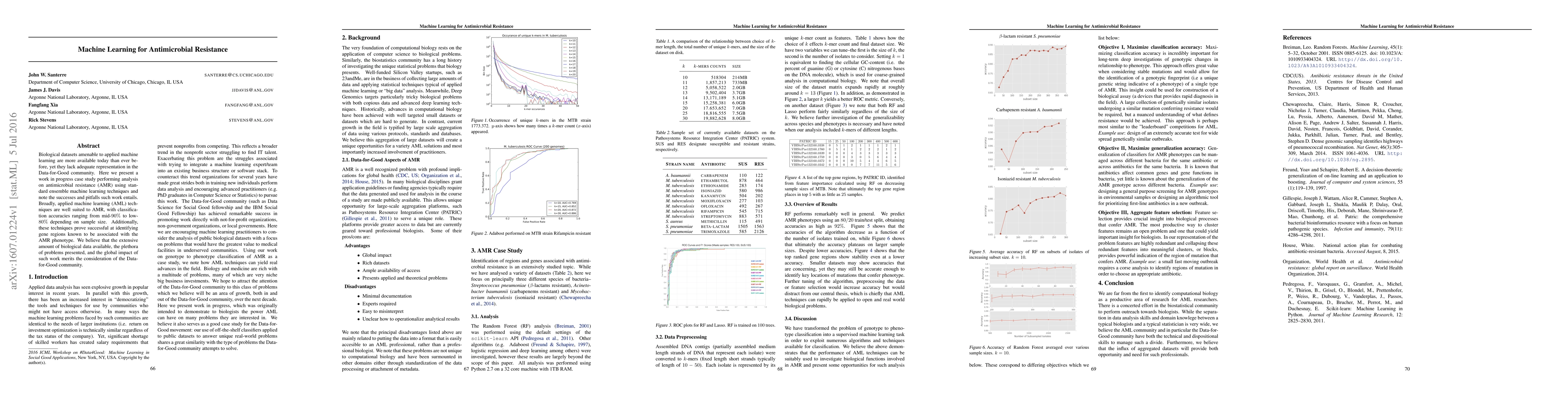 Biological datasets amenable to applied machine learning are more available today than ever before, yet they lack adequate representation in the Data-for-Good community. Here we present a work in progress case study performing analysis on antimicrobial resistance (AMR) using standard ensemble machine learning techniques and note the successes and pitfalls such work entails. Broadly, applied machine learning (AML) techniques are well suited to AMR, with classification accuracies ranging from mid-90% to low- 80% depending on sample size. Additionally, these techniques prove successful at identifying gene regions known to be associated with the AMR phenotype. We believe that the extensive amount of biological data available, the plethora of problems presented, and the global impact of such work merits the consideration of the Data- for-Good community.