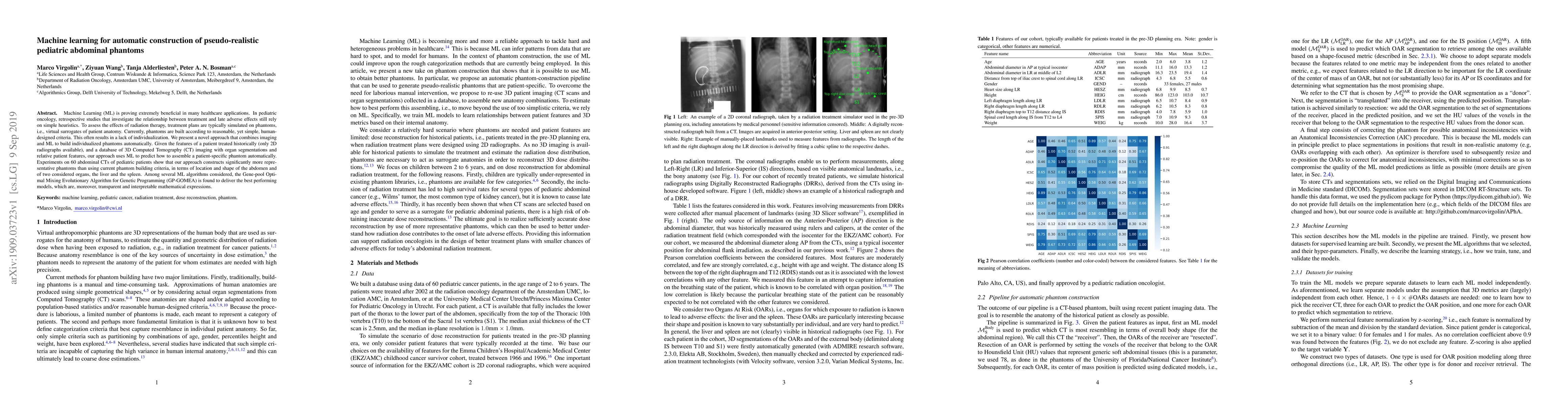 Machine Learning (ML) is proving extremely beneficial in many healthcare applications. In pediatric oncology, retrospective studies that investigate the relationship between treatment and late adverse effects still rely on simple heuristics. To assess the effects of radiation therapy, treatment plans are typically simulated on phantoms, i.e., virtual surrogates of patient anatomy. Currently, phantoms are built according to reasonable, yet simple, human-designed criteria. This often results in a lack of individualization. We present a novel approach that combines imaging and ML to build individualized phantoms automatically. Given the features of a patient treated historically (only 2D radiographs available), and a database of 3D Computed Tomography (CT) imaging with organ segmentations and relative patient features, our approach uses ML to predict how to assemble a patient-specific phantom automatically. Experiments on 60 abdominal CTs of pediatric patients show that our approach constructs significantly more representative phantoms than using current phantom building criteria, in terms of location and shape of the abdomen and of two considered organs, the liver and the spleen. Among several ML algorithms considered, the Gene-pool Optimal Mixing Evolutionary Algorithm for Genetic Programming (GP-GOMEA) is found to deliver the best performing models, which are, moreover, transparent and interpretable mathematical expressions.