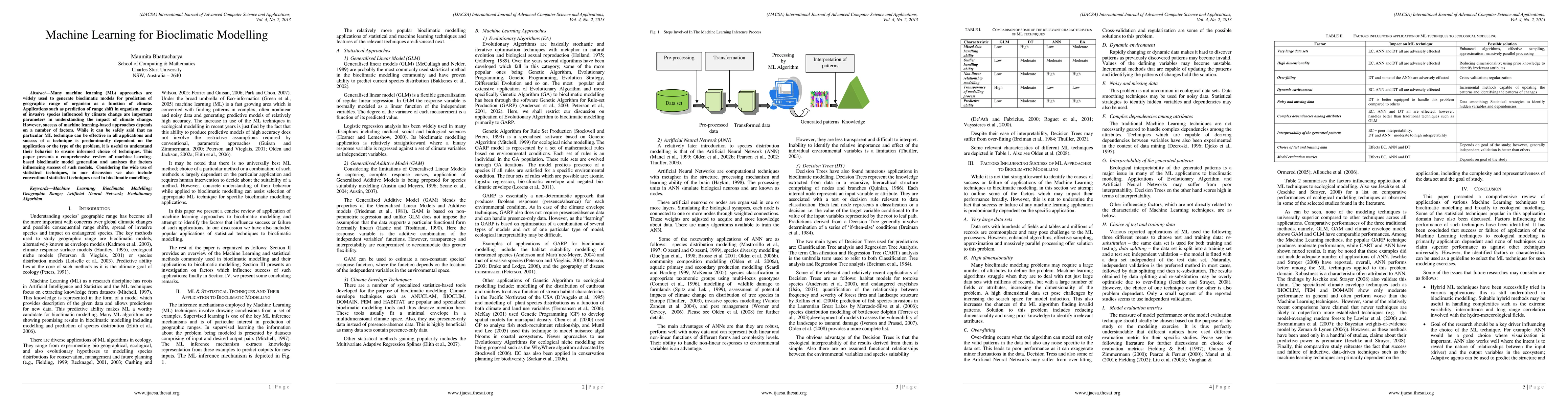 A review of machine learning approaches for bioclimatic modeling finds that while no technique can be effective in all applications, understanding their behavior is crucial for making informed choices. The study analyzes factors influencing the success of these models and discusses conventional statistical techniques used in bioclimatic modeling.
