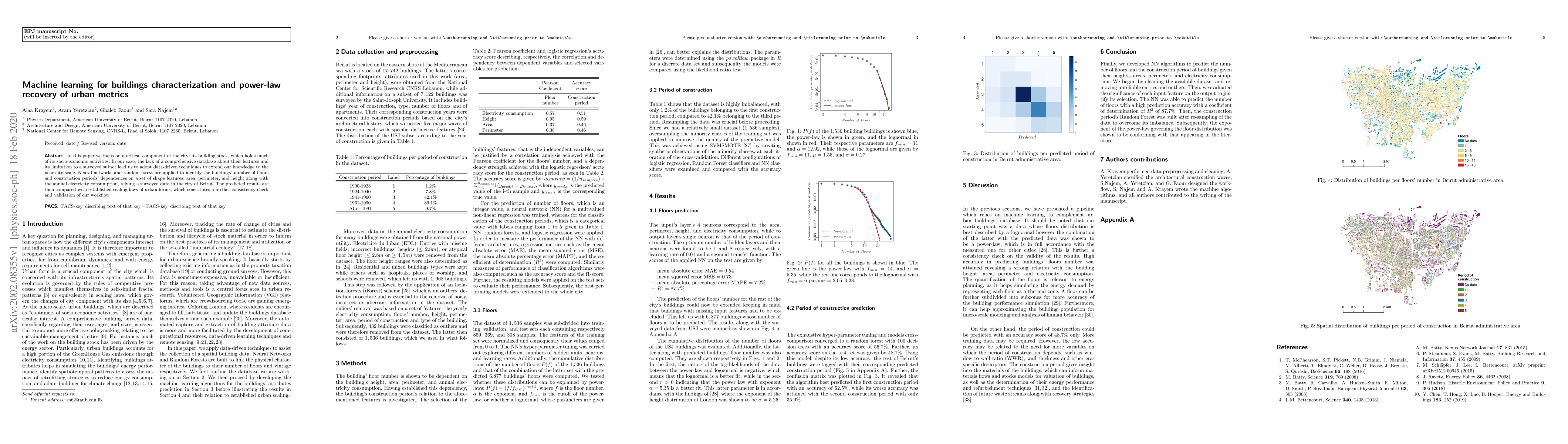 In this paper, we focus on a critical component of the city: its building stock, which holds much of its socio-economic activities. In our case, the lack of a comprehensive database about their features and its limitation to a surveyed subset lead us to adopt data-driven techniques to extend our knowledge to the near-city-scale. Neural networks and random forest are applied to identify the buildings' number of floors and construction periods' dependencies on a set of shape features: area, perimeter, and height along with the annual electricity consumption, relying on a surveyed data in the city of Beirut. The predicted results are then compared with established scaling laws of urban forms, which constitutes a further consistency check and validation of our work ow.