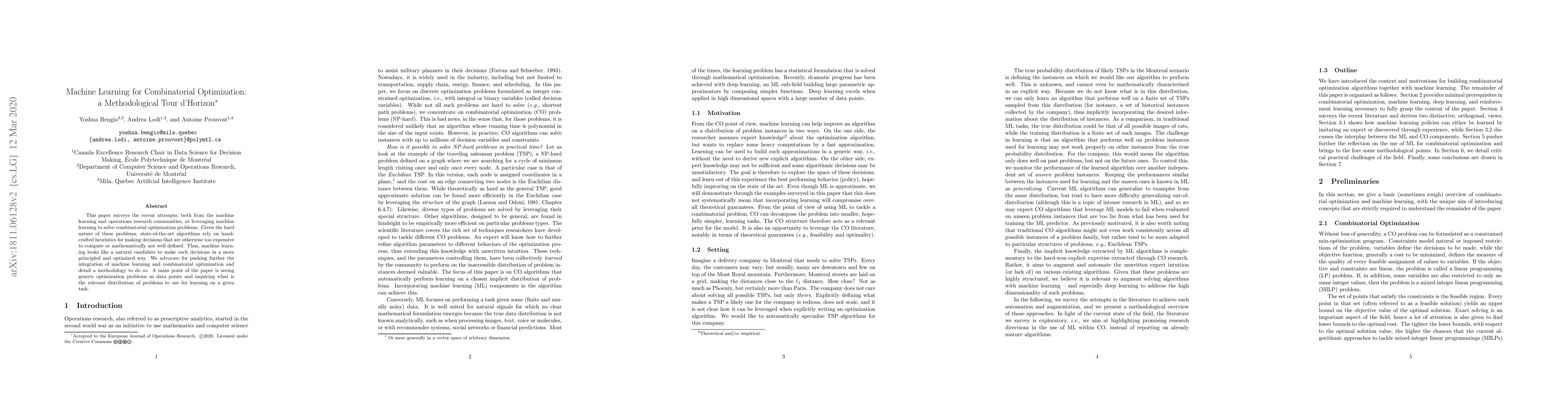 This paper surveys the recent attempts, both from the machine learning and operations research communities, at leveraging machine learning to solve combinatorial optimization problems. Given the hard nature of these problems, state-of-the-art algorithms rely on handcrafted heuristics for making decisions that are otherwise too expensive to compute or mathematically not well defined. Thus, machine learning looks like a natural candidate to make such decisions in a more principled and optimized way. We advocate for pushing further the integration of machine learning and combinatorial optimization and detail a methodology to do so. A main point of the paper is seeing generic optimization problems as data points and inquiring what is the relevant distribution of problems to use for learning on a given task.