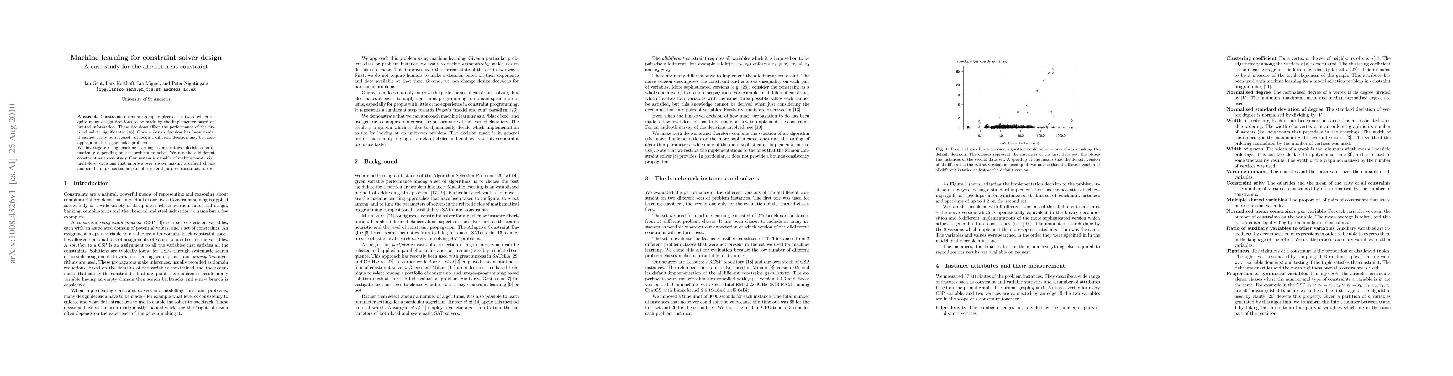 Constraint solvers are complex pieces of software which require many design decisions to be made by the implementer based on limited information. These decisions affect the performance of the finished solver significantly. Once a design decision has been made, it cannot easily be reversed, although a different decision may be more appropriate for a particular problem. We investigate using machine learning to make these decisions automatically depending on the problem to solve. We use the alldifferent constraint as a case study. Our system is capable of making non-trivial, multi-level decisions that improve over always making a default choice and can be implemented as part of a general-purpose constraint solver.