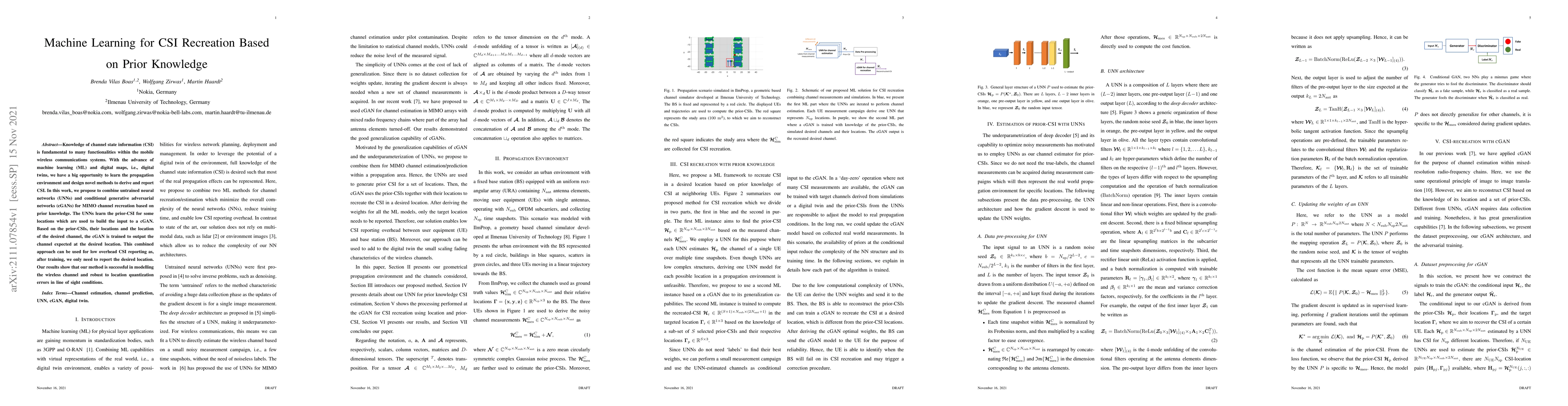 This paper proposes a machine learning approach combining untrained neural networks and conditional GANs to recreate MIMO channels based on prior knowledge, achieving low overhead CSI reporting with robustness to location errors. The method successfully models wireless channels and demonstrates effectiveness in line of sight conditions.