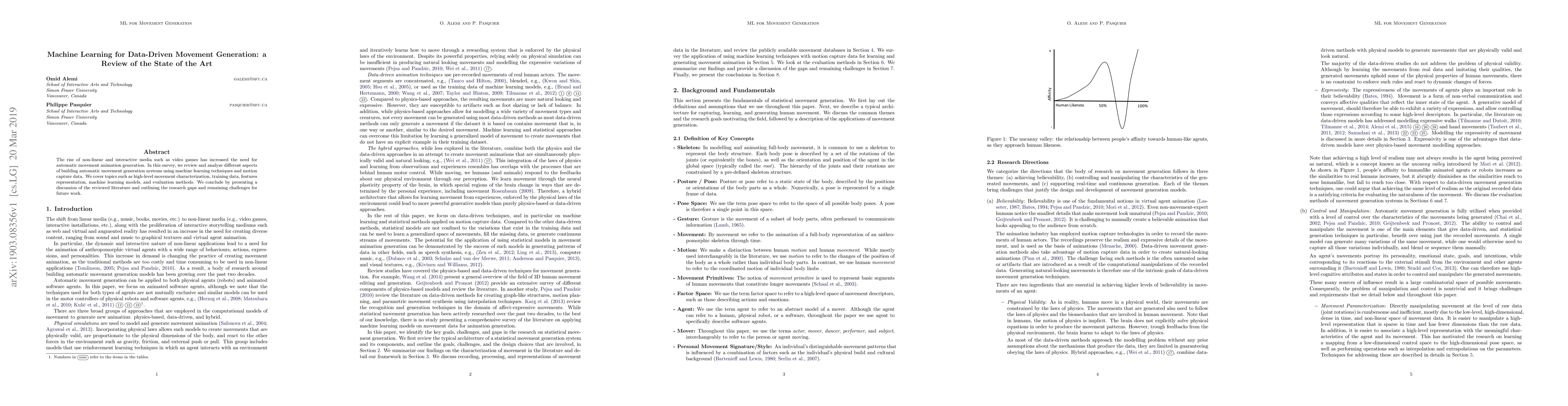The rise of non-linear and interactive media such as video games has increased the need for automatic movement animation generation. In this survey, we review and analyze different aspects of building automatic movement generation systems using machine learning techniques and motion capture data. We cover topics such as high-level movement characterization, training data, features representation, machine learning models, and evaluation methods. We conclude by presenting a discussion of the reviewed literature and outlining the research gaps and remaining challenges for future work.