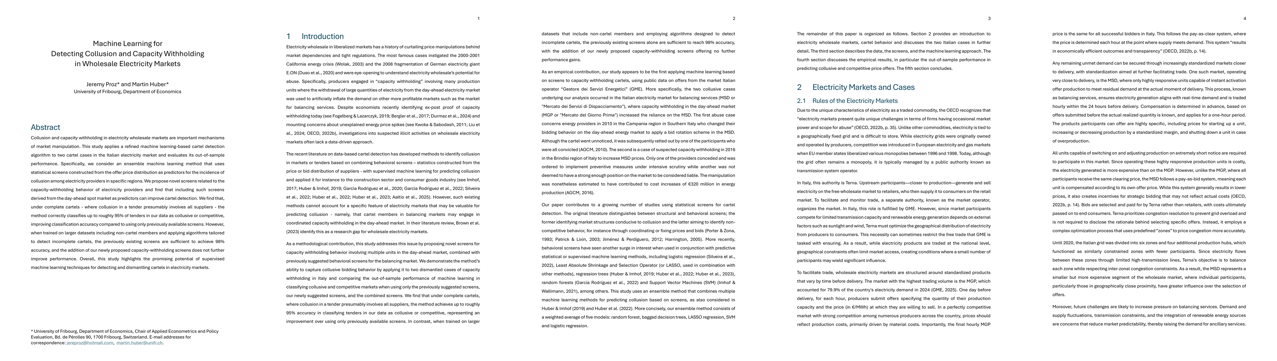Collusion and capacity withholding in electricity wholesale markets are important mechanisms of market manipulation. This study applies a refined machine learning-based cartel detection algorithm to two cartel cases in the Italian electricity market and evaluates its out-of-sample performance. Specifically, we consider an ensemble machine learning method that uses statistical screens constructed from the offer price distribution as predictors for the incidence of collusion among electricity providers in specific regions. We propose novel screens related to the capacity-withholding behavior of electricity providers and find that including such screens derived from the day-ahead spot market as predictors can improve cartel detection. We find that, under complete cartels - where collusion in a tender presumably involves all suppliers - the method correctly classifies up to roughly 95% of tenders in our data as collusive or competitive, improving classification accuracy compared to using only previously available screens. However, when trained on larger datasets including non-cartel members and applying algorithms tailored to detect incomplete cartels, the previously existing screens are sufficient to achieve 98% accuracy, and the addition of our newly proposed capacity-withholding screens does not further improve performance. Overall, this study highlights the promising potential of supervised machine learning techniques for detecting and dismantling cartels in electricity markets.