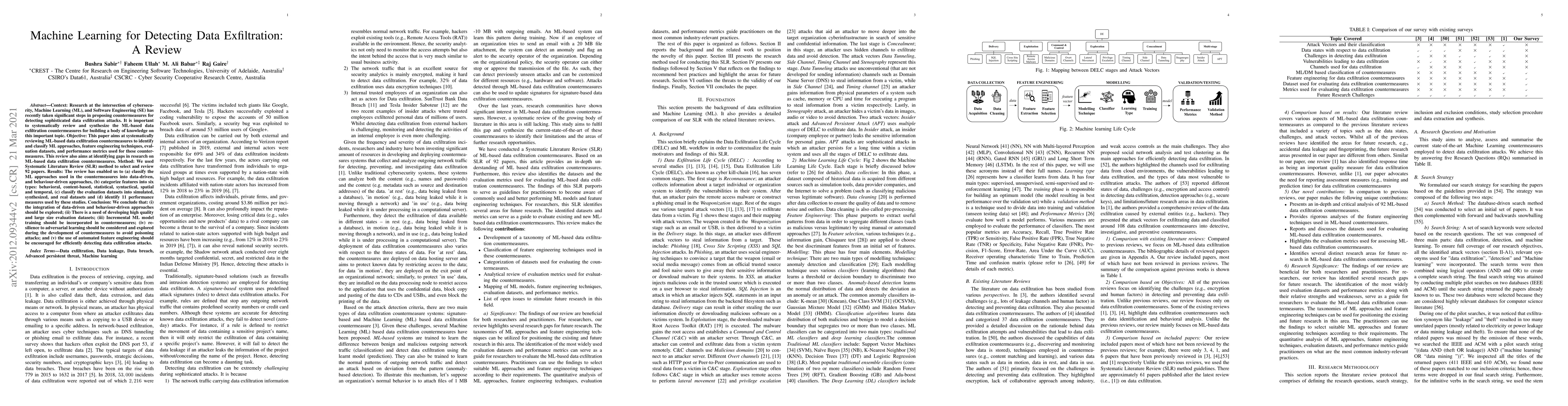 This paper systematically reviews 92 ML-based data exfiltration countermeasures, classifying ML approaches, feature types, evaluation datasets, and performance metrics. It identifies gaps, recommending the integration of data-driven and behaviour-driven approaches, development of high-quality datasets, and resilience against adversarial learning.