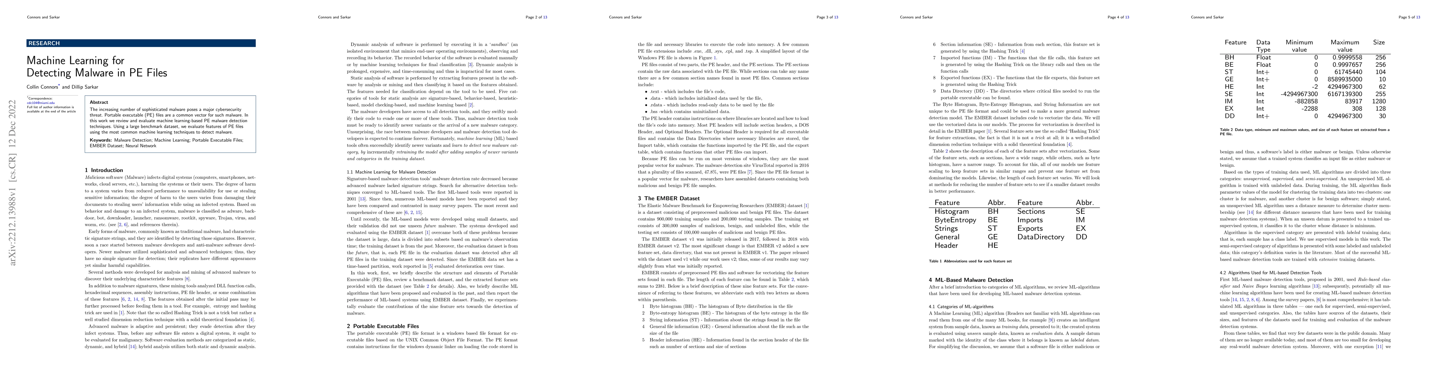 Summary: This paper reviews and evaluates machine learning techniques for detecting malware in portable executable (PE) files, employing common machine learning methods on a large benchmark dataset to identify effective features for malware detection.