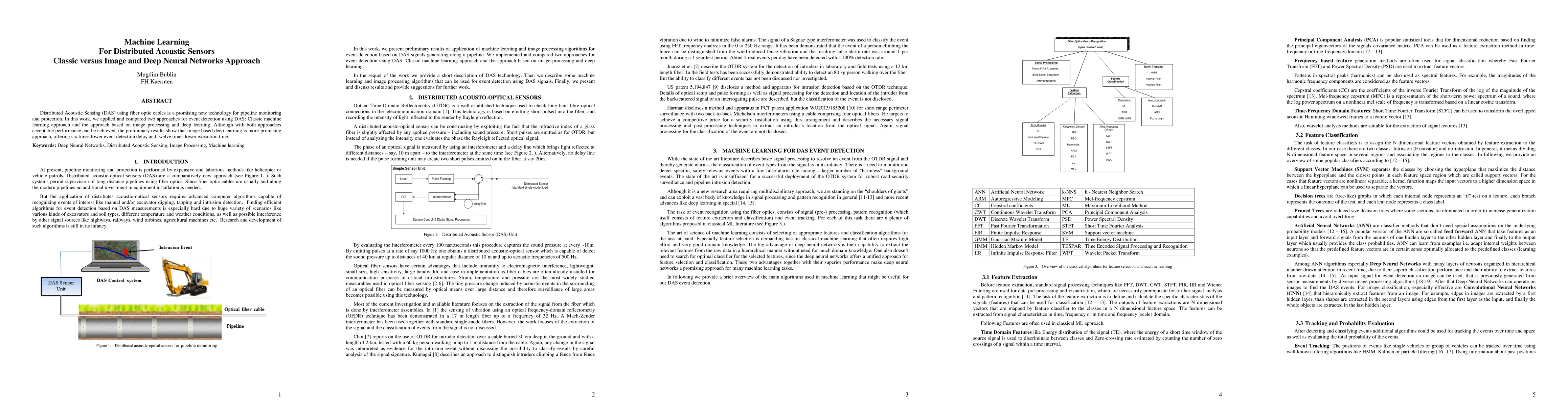 Summary: This paper compares classic machine learning and deep learning approaches for event detection in Distributed Acoustic Sensing (DAS). Preliminary results indicate that the deep learning method based on image processing offers significantly lower event detection delay and execution time, suggesting greater promise for pipeline monitoring.