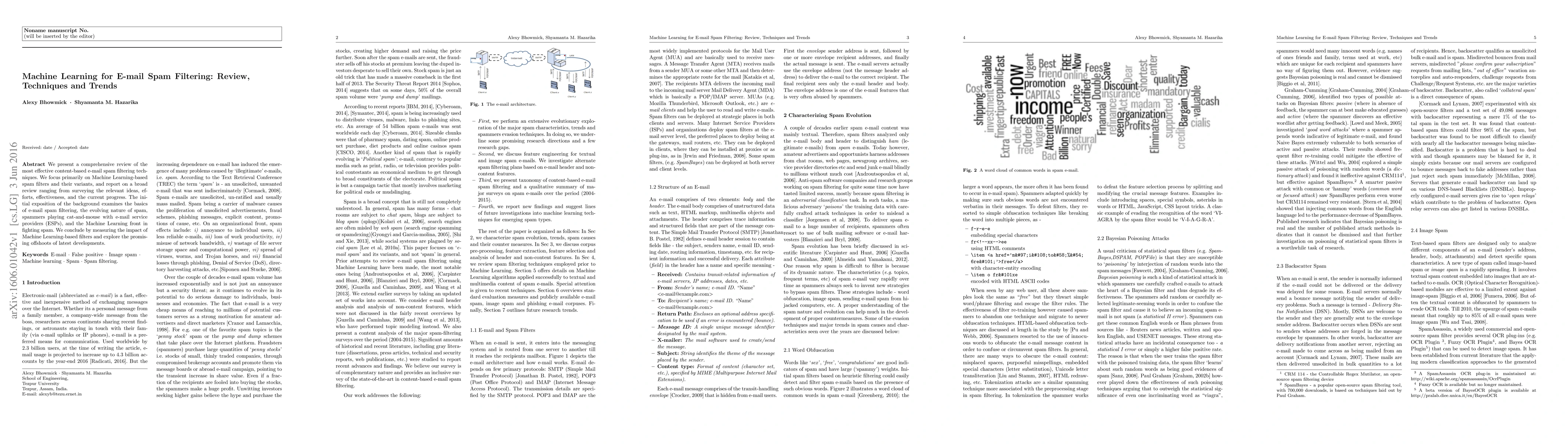 This paper provides a comprehensive review of machine learning techniques for content-based e-mail spam filtering, examining the evolution of spam, the cat-and-mouse game with service providers, and the effectiveness of machine learning-based filters, concluding with insights into current trends and future developments.
