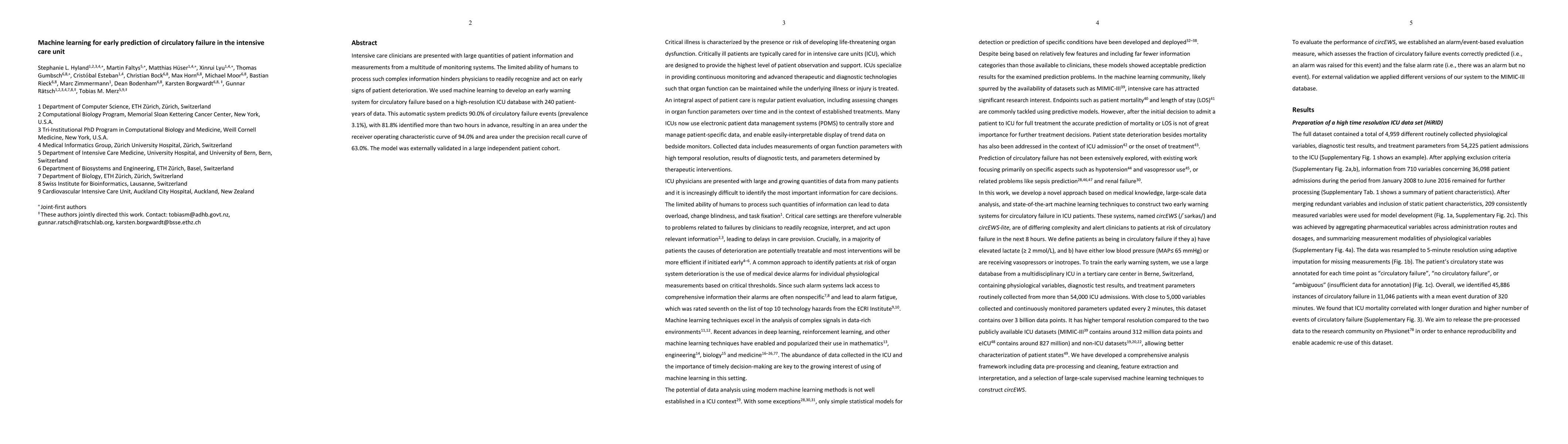 This study uses machine learning to develop an early warning system for predicting circulatory failure in ICU patients, achieving 90.0% prediction accuracy with 81.8% of events identified over two hours in advance. The model demonstrates high performance metrics and was successfully validated in an independent patient cohort.
