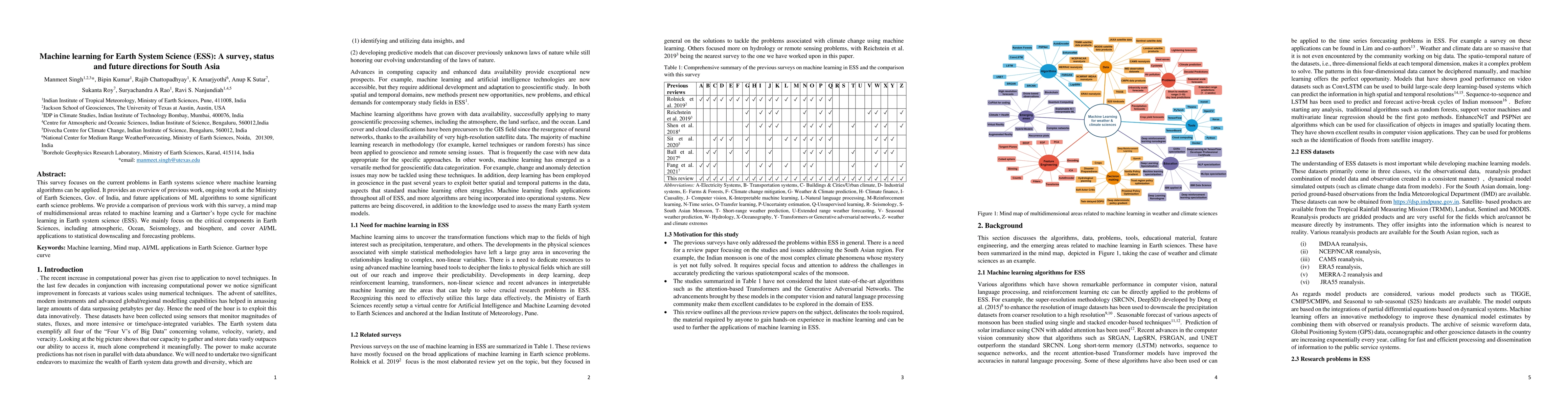 This paper surveys machine learning applications in Earth System Science, highlighting current problems in atmospheric, oceanic, seismology, and biosphere areas, and reviews ongoing work in South Asia. It also projects future ML applications and includes a Gartner's hype cycle analysis for ESS.