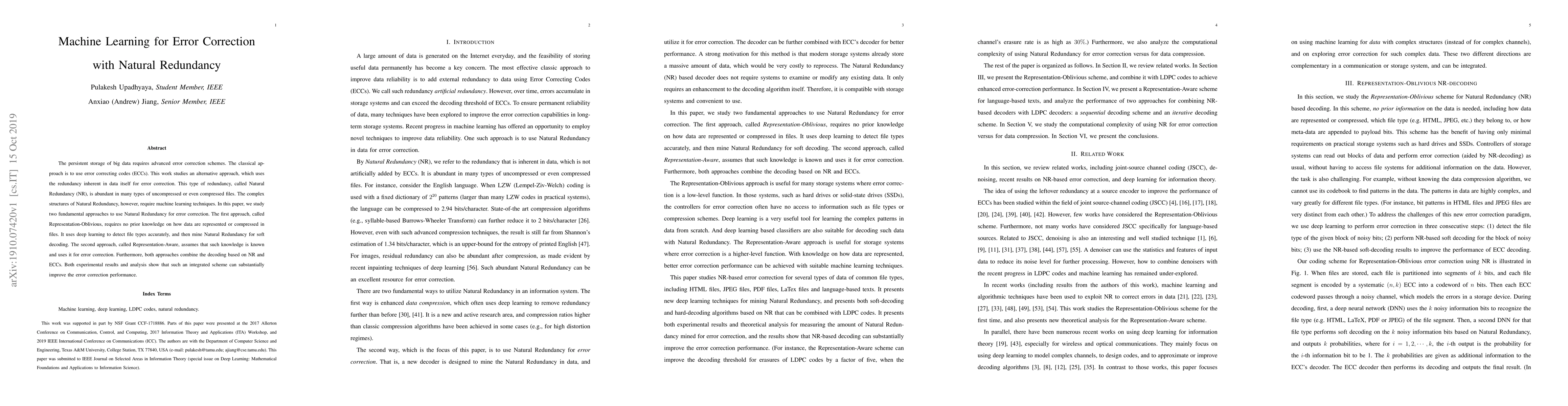 This paper explores machine learning techniques for error correction using Natural Redundancy, which leverages inherent data redundancy in big data storage. It proposes two approaches: Representation-Oblivious, which uses deep learning for redundancy detection, and Representation-Aware, which utilizes prior knowledge of data representation, both showing improved error correction performance when combined with traditional error correcting codes.