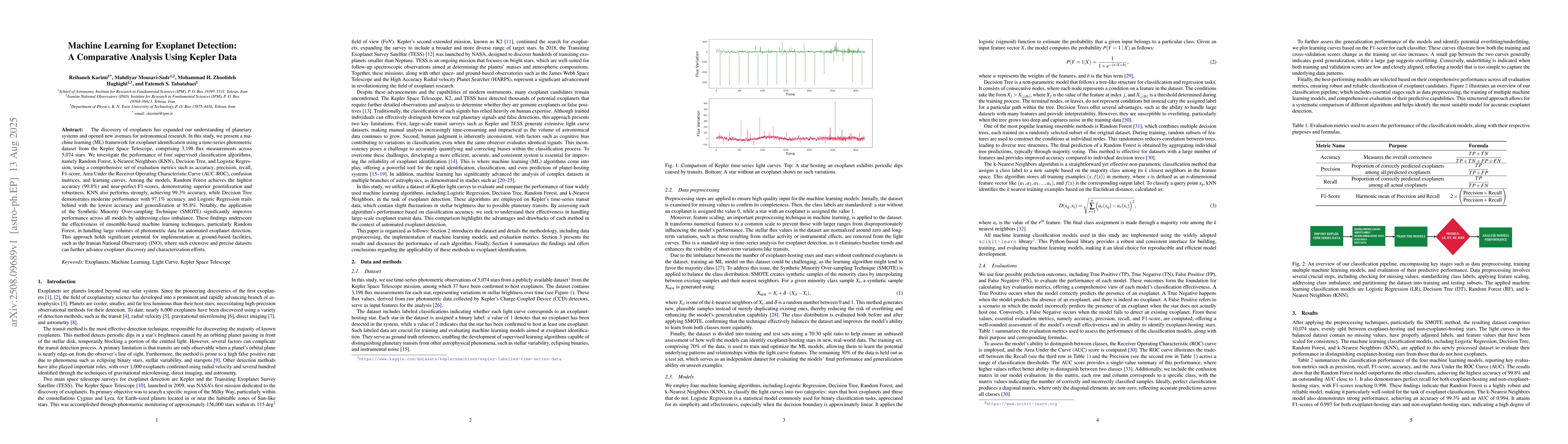 The discovery of exoplanets has expanded our understanding of planetary systems and opened new avenues for astronomical research. In this study, we present a machine learning (ML) framework for exoplanet identification using a time-series photometric dataset from the Kepler Space Telescope, comprising 3,198 flux measurements across 5,074 stars. We investigate the performance of four supervised classification algorithms, namely Random Forest, k-Nearest Neighbors (KNN), Decision Tree, and Logistic Regression, using a comprehensive set of evaluation metrics such as accuracy, precision, recall, F1-score, Area Under the Receiver Operating Characteristic Curve (AUC-ROC), confusion matrices, and learning curves. Among the models, Random Forest achieves the highest accuracy (99.8\%) and near-perfect F1-scores, demonstrating superior generalization and robustness. KNN also performs strongly, achieving 99.3\% accuracy, while Decision Tree demonstrates moderate performance with 97.1\% accuracy, and Logistic Regression trails behind with the lowest accuracy and generalization at 95.8\%. Notably, the application of the Synthetic Minority Over-sampling Technique (SMOTE) significantly improves performance across all models by addressing class imbalance. These findings underscore the effectiveness of ensemble-based machine learning techniques, particularly Random Forest, in handling large volumes of photometric data for automated exoplanet detection. This approach holds significant potential for implementation at ground-based facilities, such as the Iranian National Observatory (INO), where such extensive and precise datasets can further advance exoplanet discovery and characterization efforts.