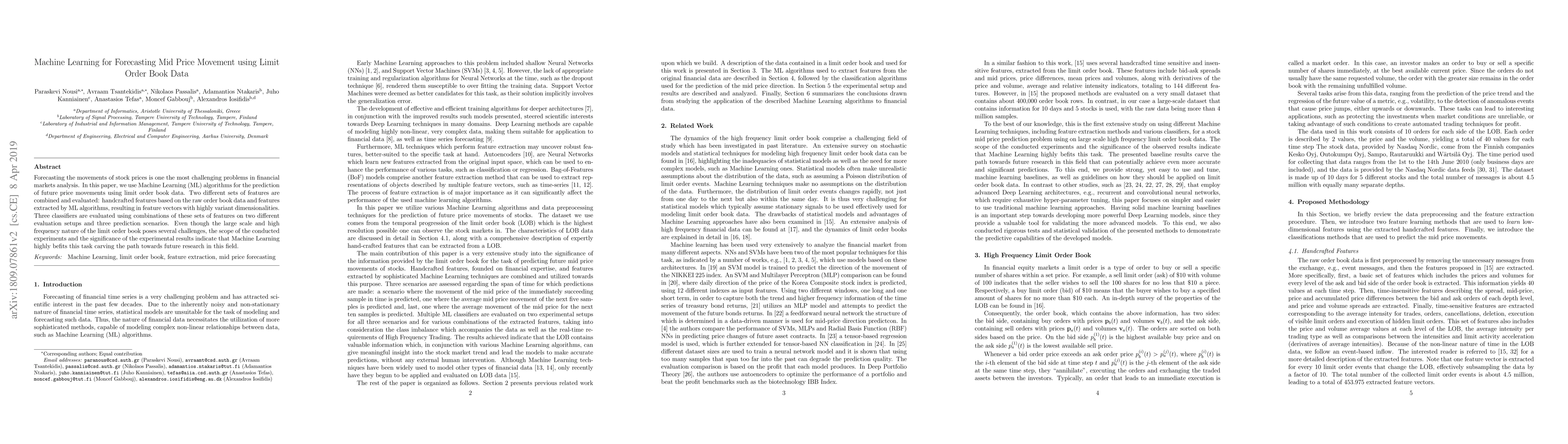 This paper explores the use of Machine Learning algorithms to predict stock price movements using limit order book data. It combines handcrafted features and ML-extracted features, evaluates three classifiers, and demonstrates the potential of ML in addressing the challenges of high-frequency trading data.
