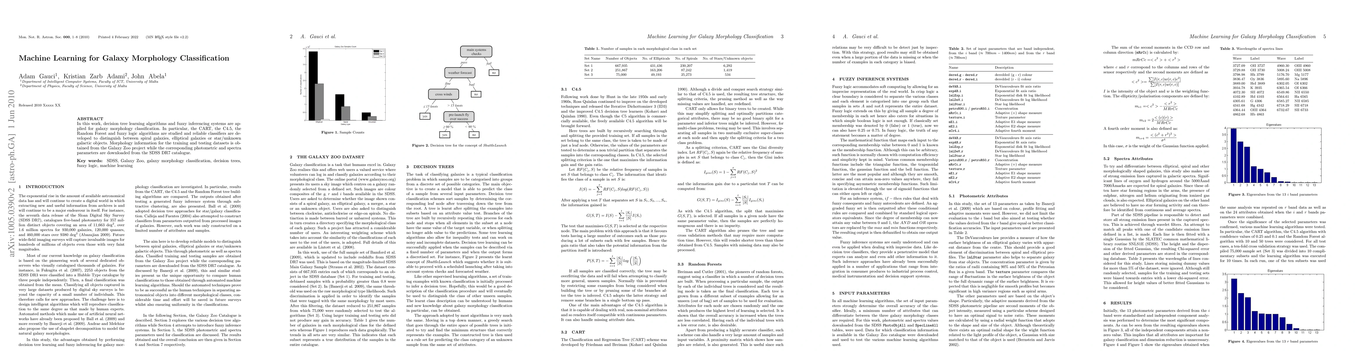 This research applies decision tree algorithms and fuzzy logic to classify galaxy morphologies using data from the Galaxy Zoo project and SDSS DR7 catalogue. The study develops reliable classifiers for distinguishing between spiral, elliptical galaxies, and star/unknown objects using CART, C4.5, Random Forest, and fuzzy logic methods.