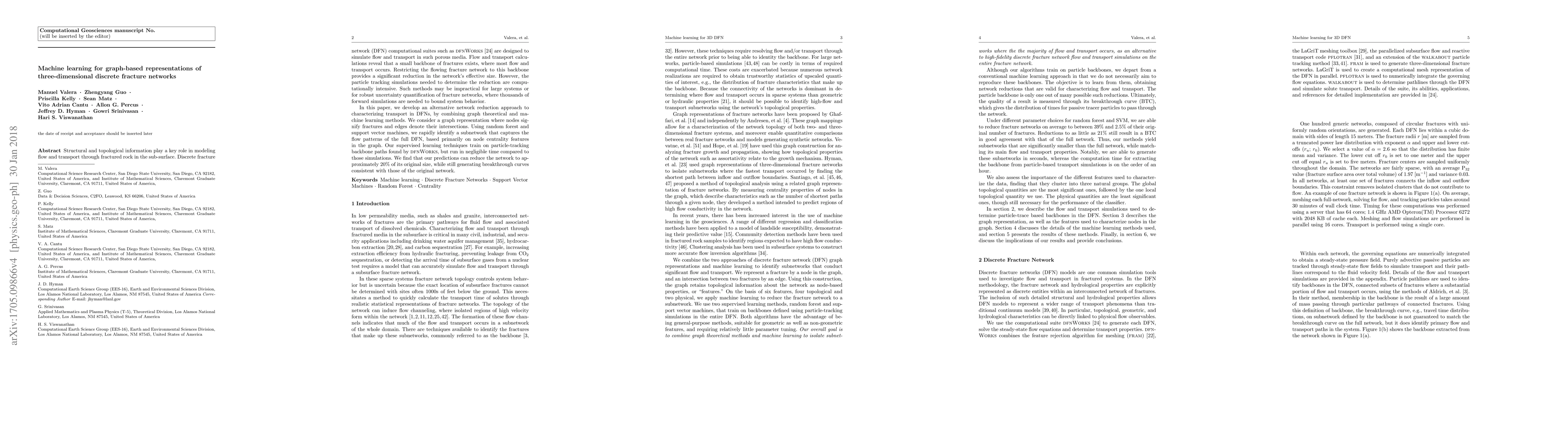 This paper proposes a machine learning approach combining graph theory and random forest/support vector machines to efficiently identify a reduced subnetwork in three-dimensional discrete fracture networks, capturing essential flow patterns with minimal computational cost. The method identifies a backbone of critical fractures, reducing the network size by 20% while maintaining accurate flow simulations.