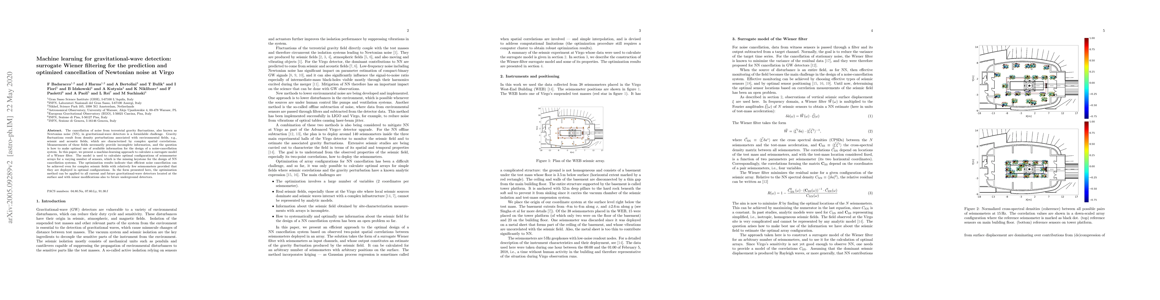 The cancellation of noise from terrestrial gravity fluctuations, also known as Newtonian noise (NN), in gravitational-wave detectors is a formidable challenge. Gravity fluctuations result from density perturbations associated with environmental fields, e.g., seismic and acoustic fields, which are characterized by complex spatial correlations. Measurements of these fields necessarily provide incomplete information, and the question is how to make optimal use of available information for the design of a noise-cancellation system. In this paper, we present a machine-learning approach to calculate a surrogate model of a Wiener filter. The model is used to calculate optimal configurations of seismometer arrays for a varying number of sensors, which is the missing keystone for the design of NN cancellation systems. The optimization results indicate that efficient noise cancellation can be achieved even for complex seismic fields with relatively few seismometers provided that they are deployed in optimal configurations. In the form presented here, the optimization method can be applied to all current and future gravitational-wave detectors located at the surface and with minor modifications also to future underground detectors.