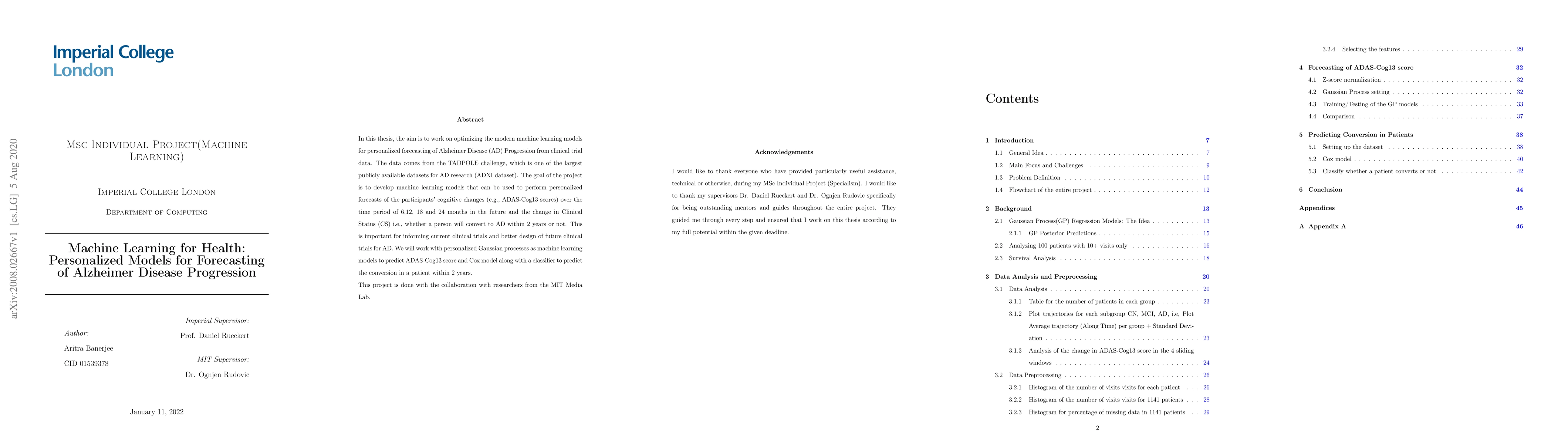 In this thesis the aim is to work on optimizing the modern machine learning models for personalized forecasting of Alzheimer Disease (AD) Progression from clinical trial data. The data comes from the TADPOLE challenge, which is one of the largest publicly available datasets for AD research (ADNI dataset). The goal of the project is to develop machine learning models that can be used to perform personalized forecasts of the participants cognitive changes (e.g., ADAS-Cog13 scores) over the time period of 6,12, 18 and 24 months in the future and the change in Clinical Status (CS) i.e., whether a person will convert to AD within 2 years or not. This is important for informing current clinical trials and better design of future clinical trials for AD. We will work with personalized Gaussian processes as machine learning models to predict ADAS-Cog13 score and Cox model along with a classifier to predict the conversion in a patient within 2 years.This project is done with the collaboration with researchers from the MIT MediaLab.