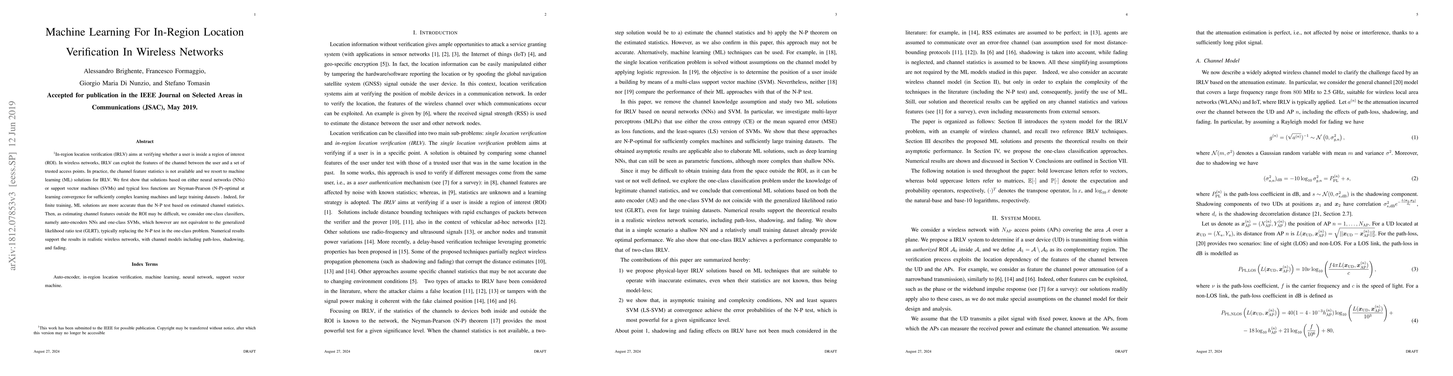 In-region location verification (IRLV) aims at verifying whether a user is inside a region of interest (ROI). In wireless networks, IRLV can exploit the features of the channel between the user and a set of trusted access points. In practice, the channel feature statistics is not available and we resort to machine learning (ML) solutions for IRLV. We first show that solutions based on either neural networks (NNs) or support vector machines (SVMs) and typical loss functions are Neyman-Pearson (N-P)-optimal at learning convergence for sufficiently complex learning machines and large training datasets . Indeed, for finite training, ML solutions are more accurate than the N-P test based on estimated channel statistics. Then, as estimating channel features outside the ROI may be difficult, we consider one-class classifiers, namely auto-encoders NNs and one-class SVMs, which however are not equivalent to the generalized likelihood ratio test (GLRT), typically replacing the N-P test in the one-class problem. Numerical results support the results in realistic wireless networks, with channel models including path-loss, shadowing, and fading.