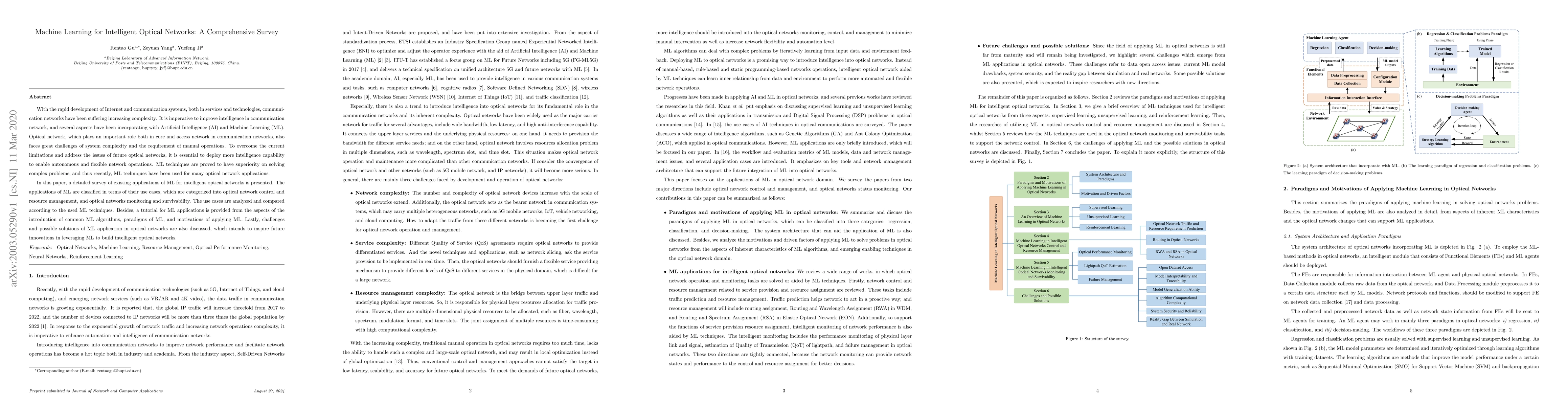 This paper surveys the application of Machine Learning (ML) techniques in intelligent optical networks, categorizing use cases into network control, resource management, monitoring, and survivability. It provides insights into ML algorithms, challenges, and potential solutions to inspire future innovations in this field.