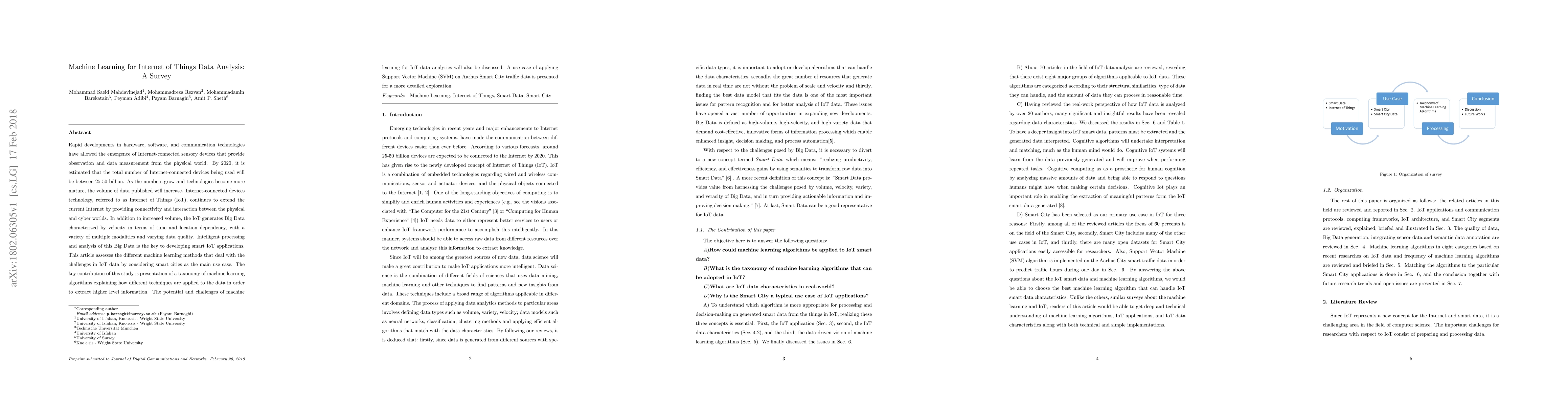 Rapid developments in hardware, software, and communication technologies have allowed the emergence of Internet-connected sensory devices that provide observation and data measurement from the physical world. By 2020, it is estimated that the total number of Internet-connected devices being used will be between 25 and 50 billion. As the numbers grow and technologies become more mature, the volume of data published will increase. Internet-connected devices technology, referred to as Internet of Things (IoT), continues to extend the current Internet by providing connectivity and interaction between the physical and cyber worlds. In addition to increased volume, the IoT generates Big Data characterized by velocity in terms of time and location dependency, with a variety of multiple modalities and varying data quality. Intelligent processing and analysis of this Big Data is the key to developing smart IoT applications. This article assesses the different machine learning methods that deal with the challenges in IoT data by considering smart cities as the main use case. The key contribution of this study is presentation of a taxonomy of machine learning algorithms explaining how different techniques are applied to the data in order to extract higher level information. The potential and challenges of machine learning for IoT data analytics will also be discussed. A use case of applying Support Vector Machine (SVM) on Aarhus Smart City traffic data is presented for a more detailed exploration.