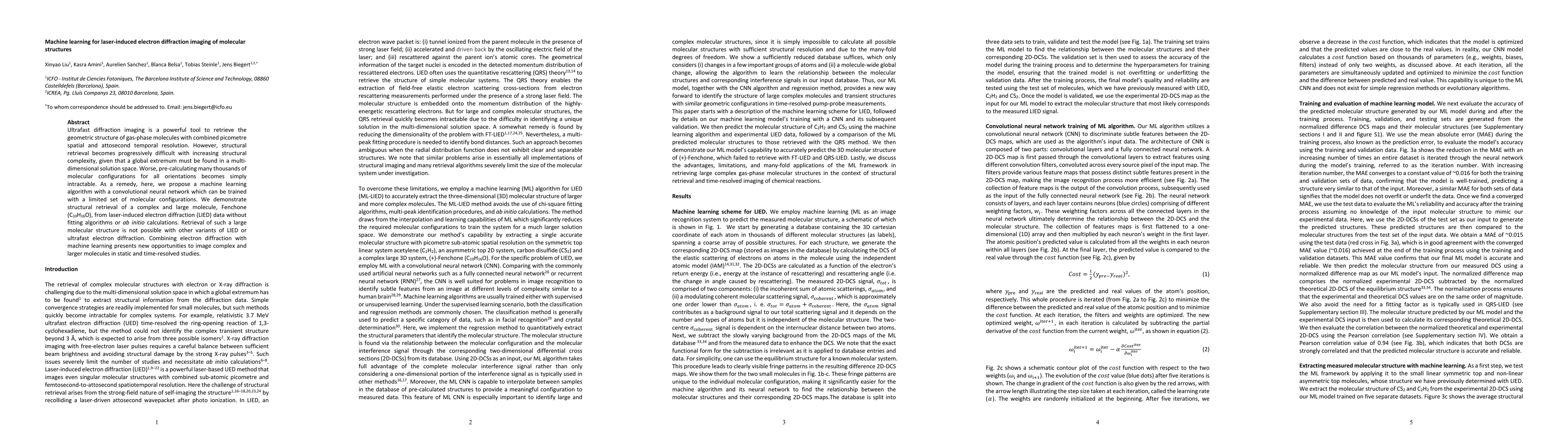 Ultrafast diffraction imaging is a powerful tool to retrieve the geometric structure of gas-phase molecules with combined picometre spatial and attosecond temporal resolution. However, structural retrieval becomes progressively difficult with increasing structural complexity, given that a global extremum must be found in a multi-dimensional solution space. Worse, pre-calculating many thousands of molecular configurations for all orientations becomes simply intractable. As a remedy, here, we propose a machine learning algorithm with a convolutional neural network which can be trained with a limited set of molecular configurations. We demonstrate structural retrieval of a complex and large molecule, Fenchone (C$_{10}$H$_{16}$O), from laser-induced electron diffraction (LIED) data without fitting algorithms or ab initio calculations. Retrieval of such a large molecular structure is not possible with other variants of LIED or ultrafast electron diffraction. Combining electron diffraction with machine learning presents new opportunities to image complex and larger molecules in static and time-resolved studies.