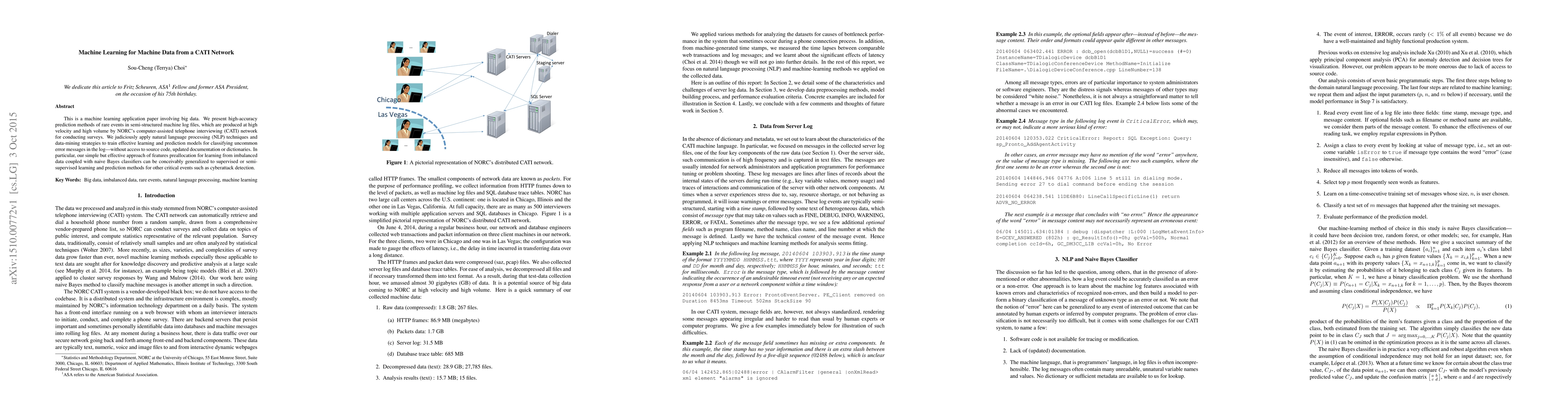 This is a machine learning application paper involving big data. We present high-accuracy prediction methods of rare events in semi-structured machine log files, which are produced at high velocity and high volume by NORC's computer-assisted telephone interviewing (CATI) network for conducting surveys. We judiciously apply natural language processing (NLP) techniques and data-mining strategies to train effective learning and prediction models for classifying uncommon error messages in the log---without access to source code, updated documentation or dictionaries. In particular, our simple but effective approach of features preallocation for learning from imbalanced data coupled with naive Bayes classifiers can be conceivably generalized to supervised or semi-supervised learning and prediction methods for other critical events such as cyberattack detection.