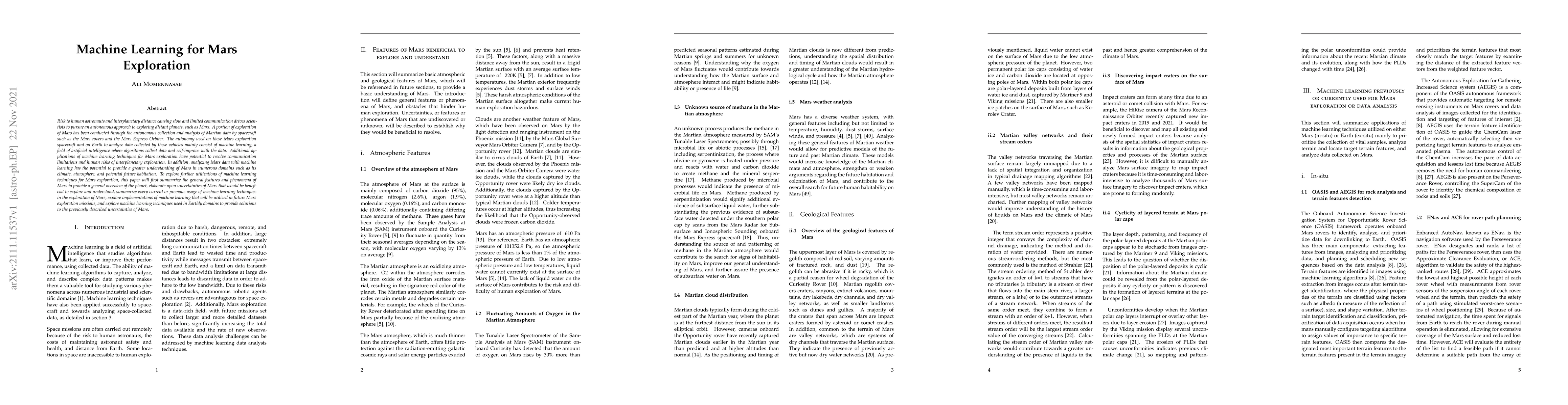This paper explores the application of machine learning to Mars exploration, emphasizing autonomous data analysis to mitigate communication delays and human risks. It reviews current and future uses of machine learning in analyzing Martian data to enhance understanding of Mars' environment and potential for habitation.