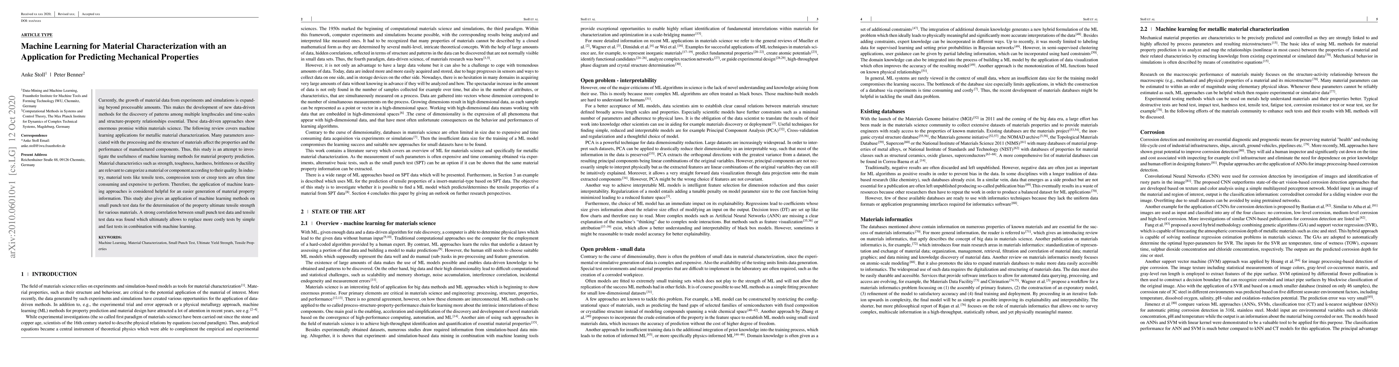 Currently, the growth of material data from experiments and simulations is expanding beyond processable amounts. This makes the development of new data-driven methods for the discovery of patterns among multiple lengthscales and time-scales and structure-property relationships essential. These data-driven approaches show enormous promise within materials science. The following review covers machine learning applications for metallic material characterization. Many parameters associated with the processing and the structure of materials affect the properties and the performance of manufactured components. Thus, this study is an attempt to investigate the usefulness of machine learning methods for material property prediction. Material characteristics such as strength, toughness, hardness, brittleness or ductility are relevant to categorize a material or component according to their quality. In industry, material tests like tensile tests, compression tests or creep tests are often time consuming and expensive to perform. Therefore, the application of machine learning approaches is considered helpful for an easier generation of material property information. This study also gives an application of machine learning methods on small punch test data for the determination of the property ultimate tensile strength for various materials. A strong correlation between small punch test data and tensile test data was found which ultimately allows to replace more costly tests by simple and fast tests in combination with machine learning.