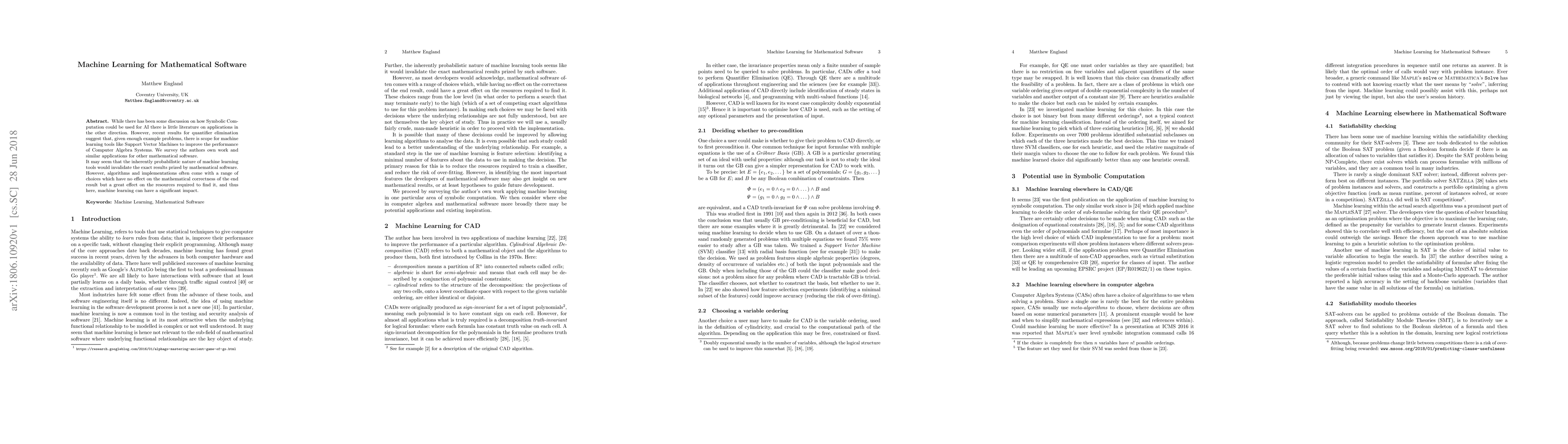 While there has been some discussion on how Symbolic Computation could be used for AI there is little literature on applications in the other direction. However, recent results for quantifier elimination suggest that, given enough example problems, there is scope for machine learning tools like Support Vector Machines to improve the performance of Computer Algebra Systems. We survey the authors own work and similar applications for other mathematical software. It may seem that the inherently probabilistic nature of machine learning tools would invalidate the exact results prized by mathematical software. However, algorithms and implementations often come with a range of choices which have no effect on the mathematical correctness of the end result but a great effect on the resources required to find it, and thus here, machine learning can have a significant impact.