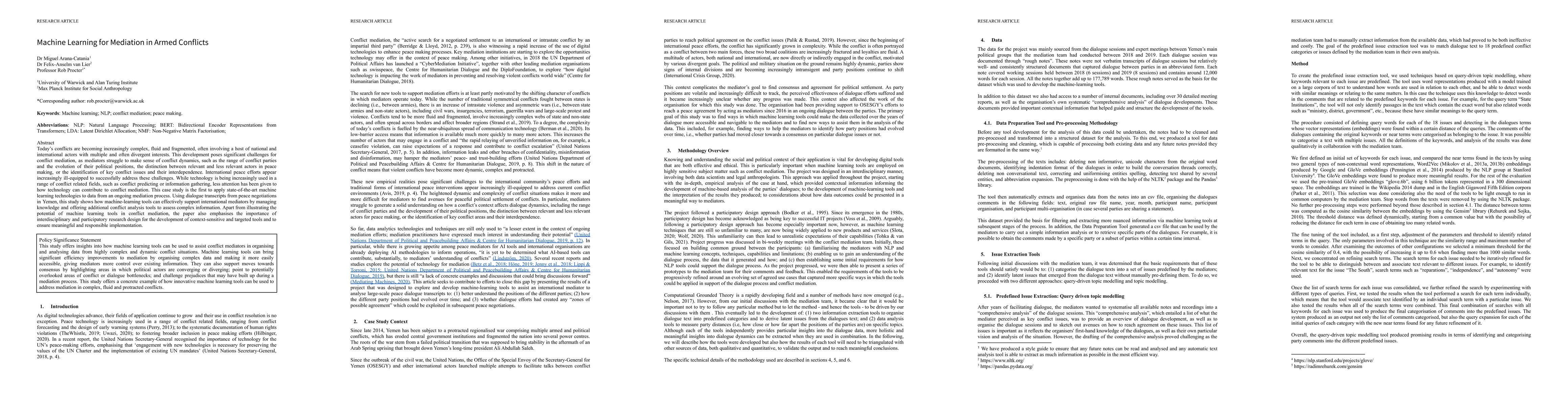 This paper explores the application of machine learning in conflict mediation, demonstrating its potential to assist mediators in managing complex information from peace negotiations in Yemen. It emphasizes the importance of interdisciplinary collaboration for developing context-sensitive tools and responsible implementation.