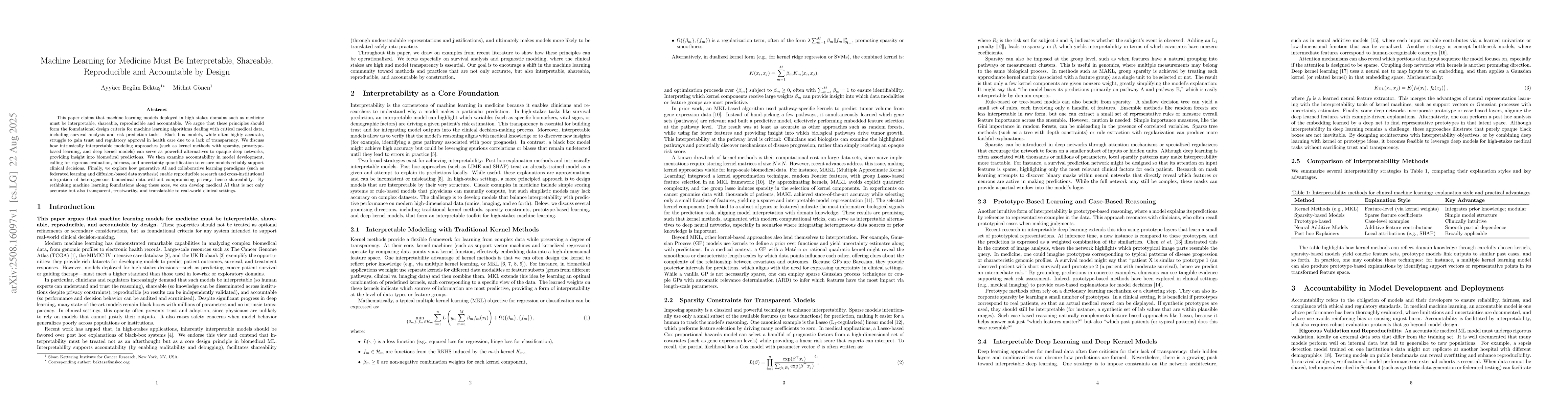 This paper claims that machine learning models deployed in high stakes domains such as medicine must be interpretable, shareable, reproducible and accountable. We argue that these principles should form the foundational design criteria for machine learning algorithms dealing with critical medical data, including survival analysis and risk prediction tasks. Black box models, while often highly accurate, struggle to gain trust and regulatory approval in health care due to a lack of transparency. We discuss how intrinsically interpretable modeling approaches (such as kernel methods with sparsity, prototype-based learning, and deep kernel models) can serve as powerful alternatives to opaque deep networks, providing insight into biomedical predictions. We then examine accountability in model development, calling for rigorous evaluation, fairness, and uncertainty quantification to ensure models reliably support clinical decisions. Finally, we explore how generative AI and collaborative learning paradigms (such as federated learning and diffusion-based data synthesis) enable reproducible research and cross-institutional integration of heterogeneous biomedical data without compromising privacy, hence shareability. By rethinking machine learning foundations along these axes, we can develop medical AI that is not only accurate but also transparent, trustworthy, and translatable to real-world clinical settings.