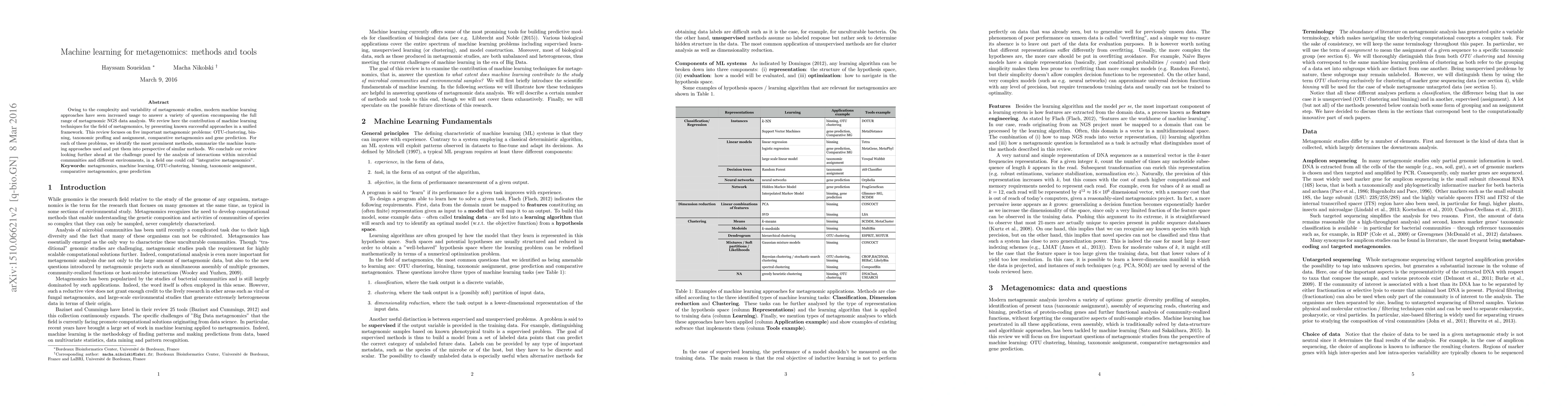 This paper reviews the application of machine learning techniques to metagenomics, focusing on five key problems: OTU-clustering, binning, taxonomic profiling, comparative metagenomics, and gene prediction. It highlights successful methods and their comparative effectiveness in analyzing complex metagenomic data.
