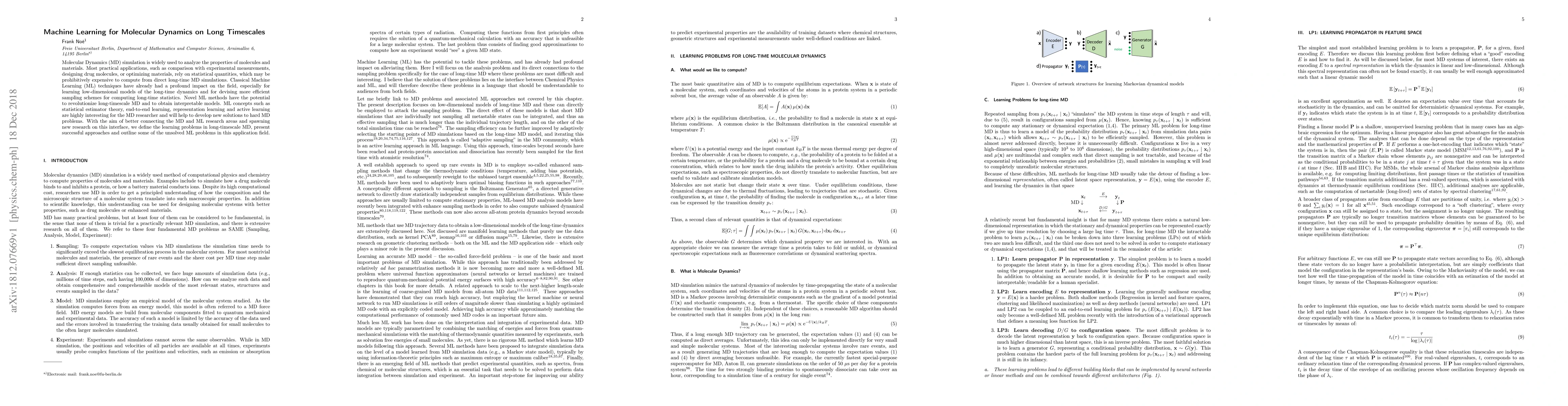Molecular Dynamics (MD) simulation is widely used to analyze the properties of molecules and materials. Most practical applications, such as comparison with experimental measurements, designing drug molecules, or optimizing materials, rely on statistical quantities, which may be prohibitively expensive to compute from direct long-time MD simulations. Classical Machine Learning (ML) techniques have already had a profound impact on the field, especially for learning low-dimensional models of the long-time dynamics and for devising more efficient sampling schemes for computing long-time statistics. Novel ML methods have the potential to revolutionize long-timescale MD and to obtain interpretable models. ML concepts such as statistical estimator theory, end-to-end learning, representation learning and active learning are highly interesting for the MD researcher and will help to develop new solutions to hard MD problems. With the aim of better connecting the MD and ML research areas and spawning new research on this interface, we define the learning problems in long-timescale MD, present successful approaches and outline some of the unsolved ML problems in this application field.