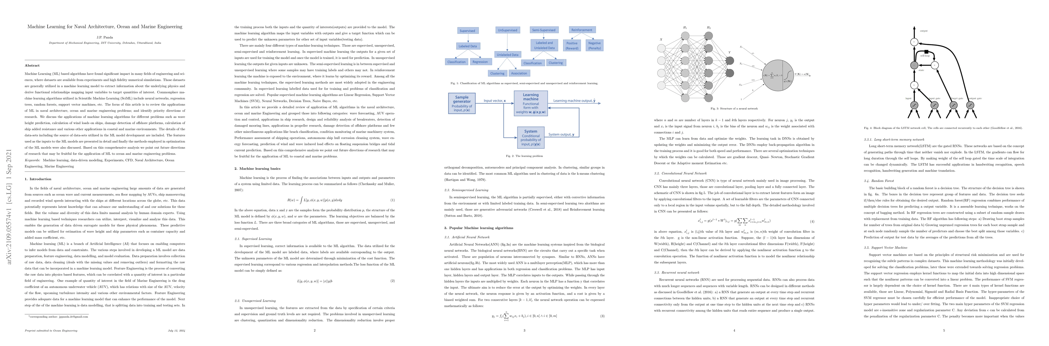 This paper reviews the application of machine learning algorithms in naval architecture, ocean, and marine engineering, highlighting uses such as wave height prediction and damage detection. It identifies future research directions for optimizing these models and improving their predictive capabilities.